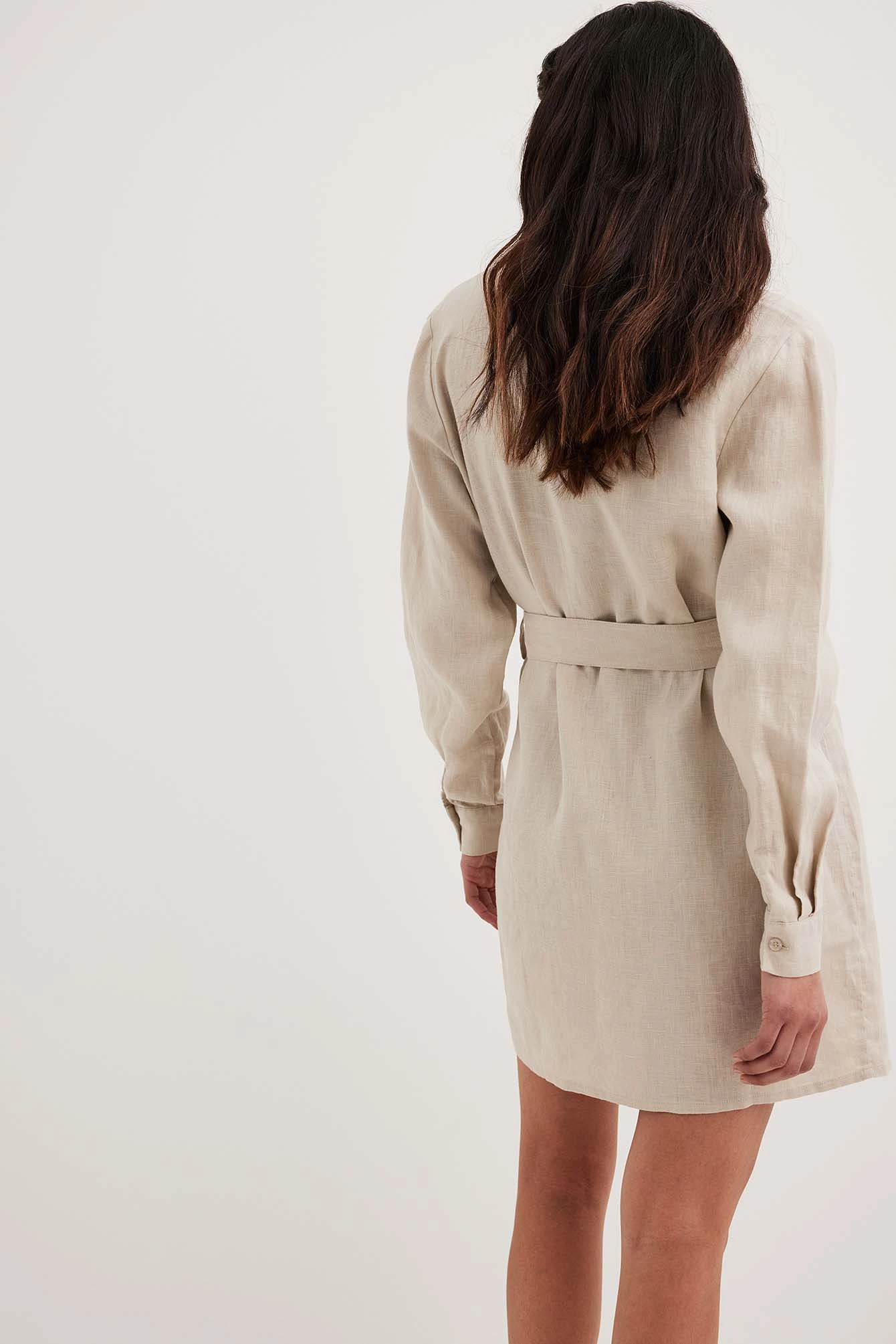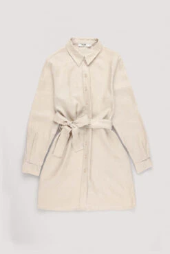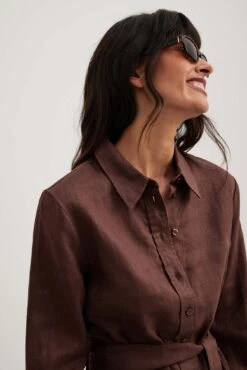 Cette robe chemise est faite en lin et a un col classique. Elle a des manches longues avec manchette simple et une taille courte. Notre robe chemise a une ceinture ajustable amovible et un bouton de fermeture.