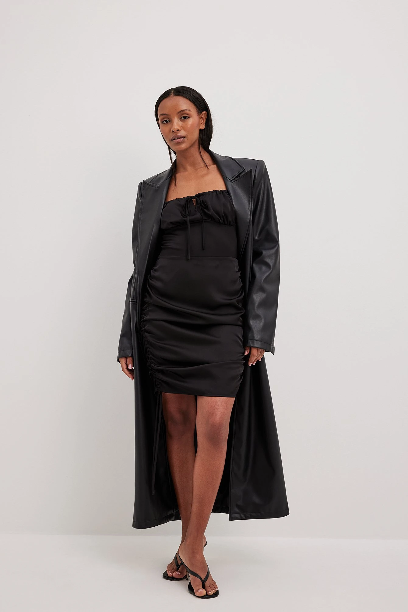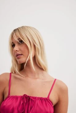 Cette robe courte est faite en satin et a des bretelles ajustables. Elle a un ajustable sur le col et un dos froncé. Cette robe courte a une fermeture éclair latérale cachée et des cordons sur les côtés.