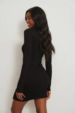 Cette robe courte a un col haut, des manches longues, un dĂ©tail fendu Ă l’avant et un design Ă nervures.