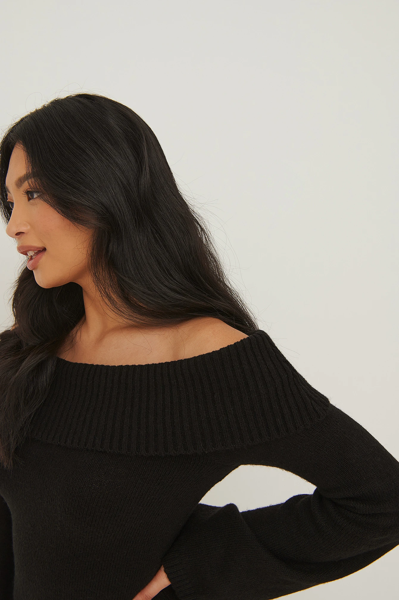 Cette robe a une manche longue, un style à épaules dénudées, un design à rabat et une matière tricotée.