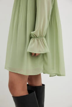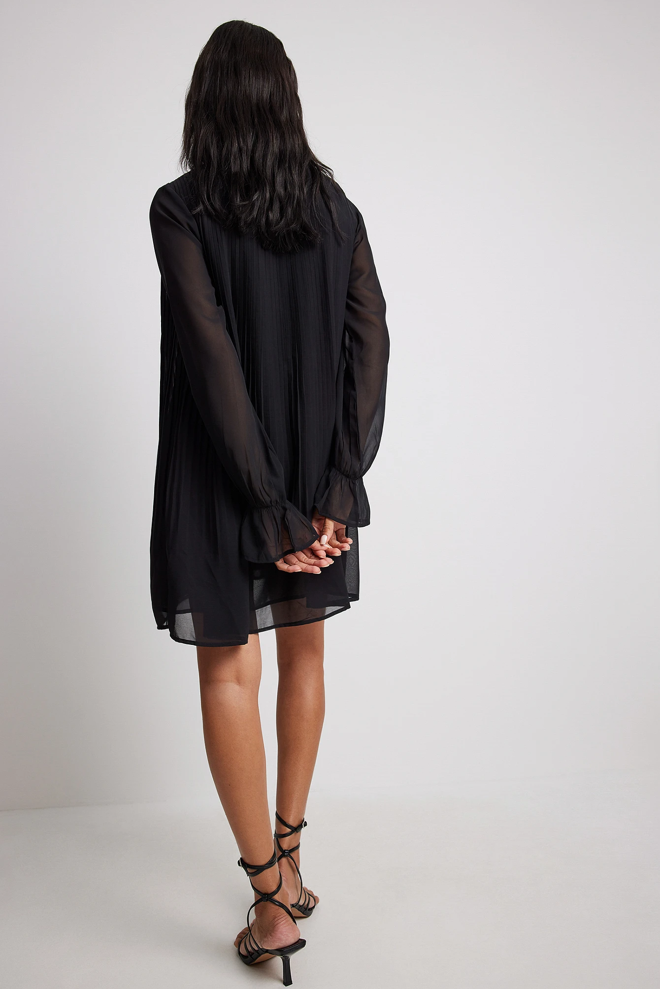 Cette robe courte a un design Ă plis. Elle a un col haut avec petits dĂ©tails Ă volants et un bouton de fermeture Ă l’arrière de la nuque. Cette robe courte a des longues manches ballon, une doublure intĂ©rieure, une coupe fluide et une matière lĂ©gère et douce.