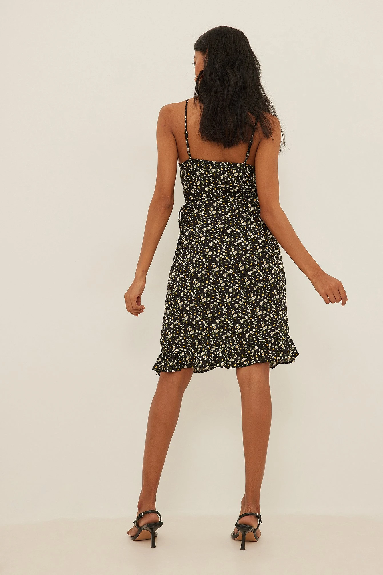 Cette robe a un col en V. Elle a des bretelles fines réglables et un design enveloppant avec cordon ajustable. Cette robe a des détails volantés, une coupe fluide et une taille courte.