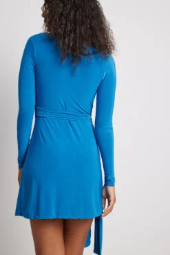 Cette robe courte a des manches longues et un design enveloppant avec fronces.