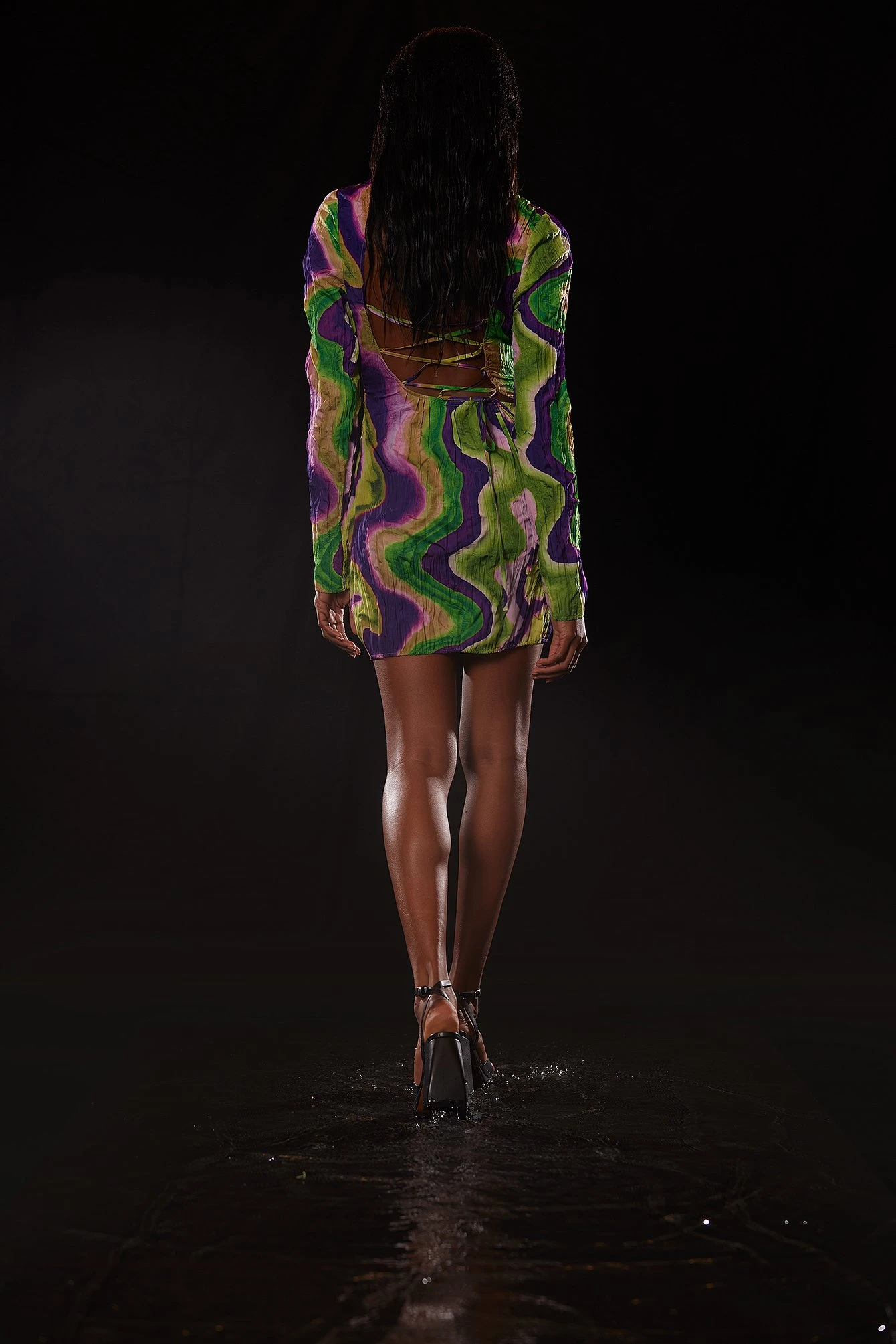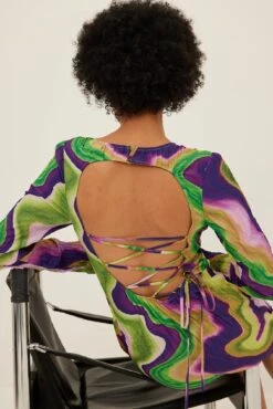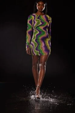Cette robe courte a un col arrondi avec bouton de fermeture à l’arrière de la nuque, des manches longues, un dos ouvert avec détail auto-sérré, une fermeture éclair latérale, un ourlet inférieur élastique et une matière structurée.