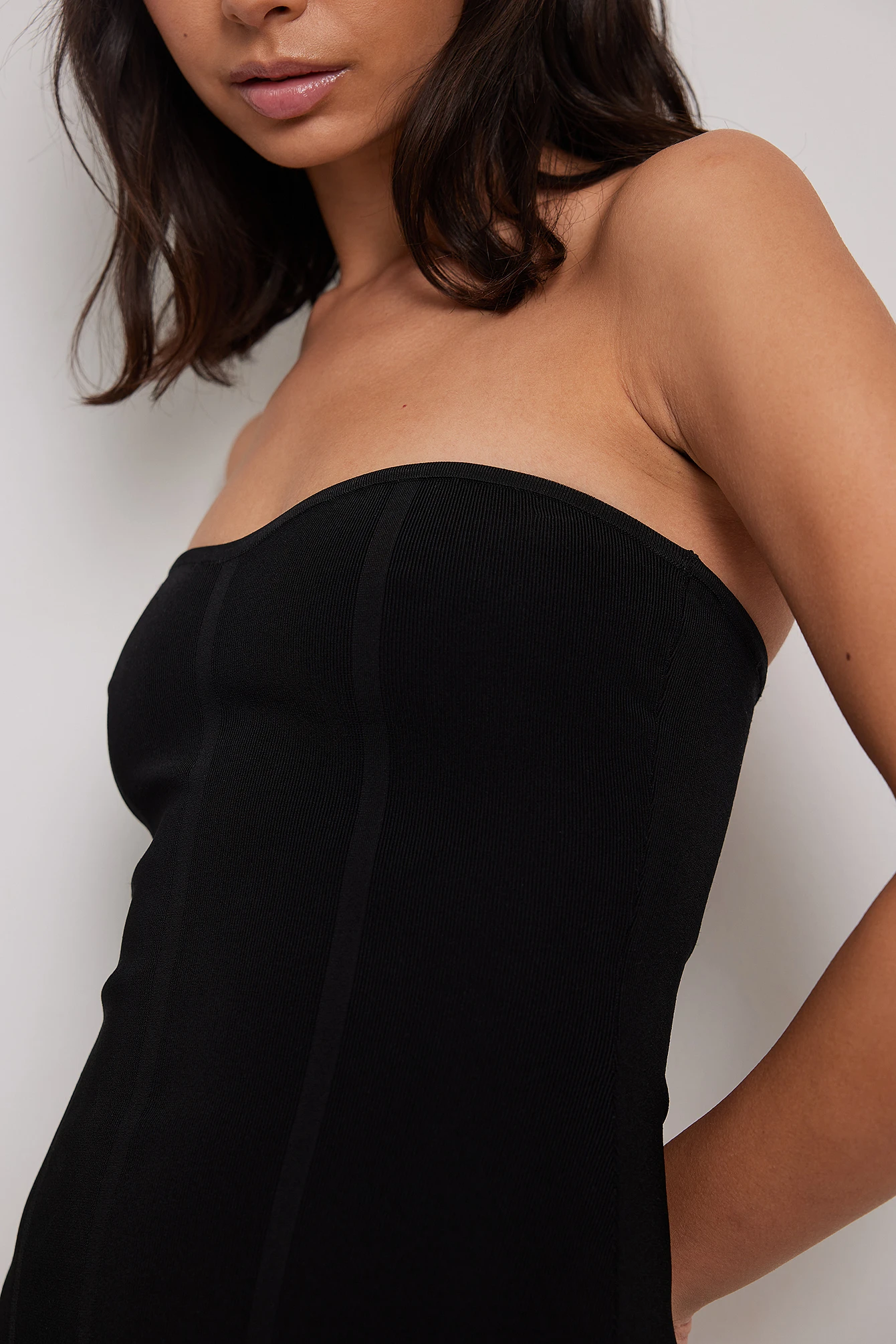 Cette robe courte est à épaule dénudée, moulante et élastique et a un design corset, une matière en tricot fin et une taille courte.