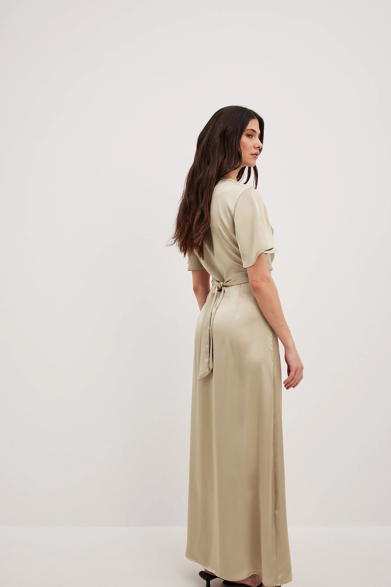 Cette robe longue a du tissu en satin. Elle a une coupe fluide et un design chevauchant avec ceinture ajustable. Cette robe longue a des manches courtes avec une coupe évasée et un col en V.