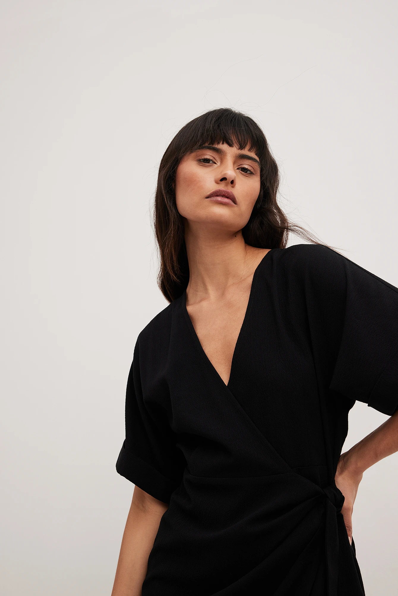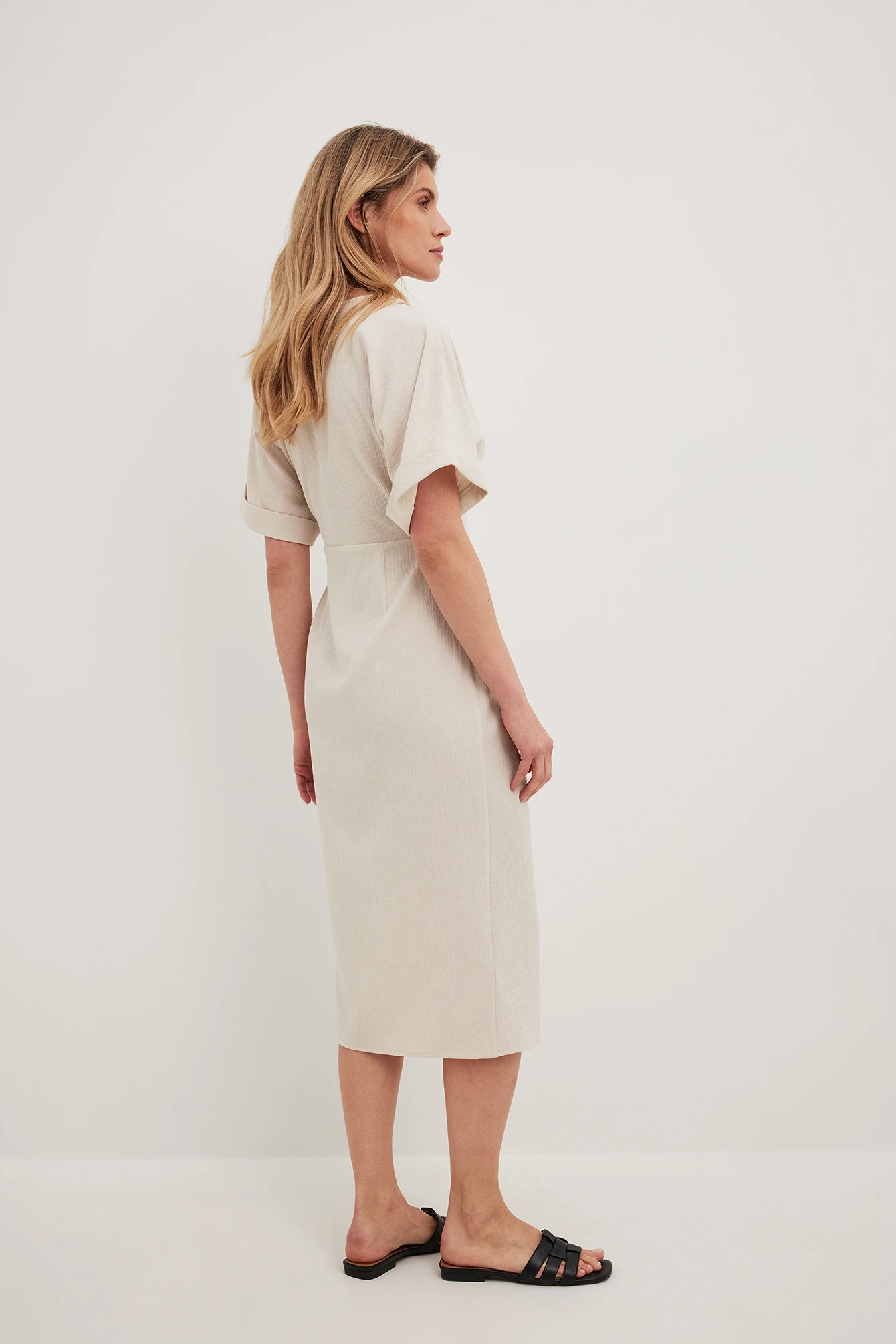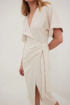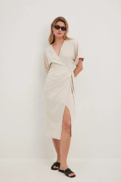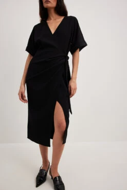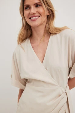 Cette robe midi a une matière texturée. Elle a un design chevauchant avec détail auto-sérré et un col en V. Cette robe midi a des manches courtes avec coupe ample.