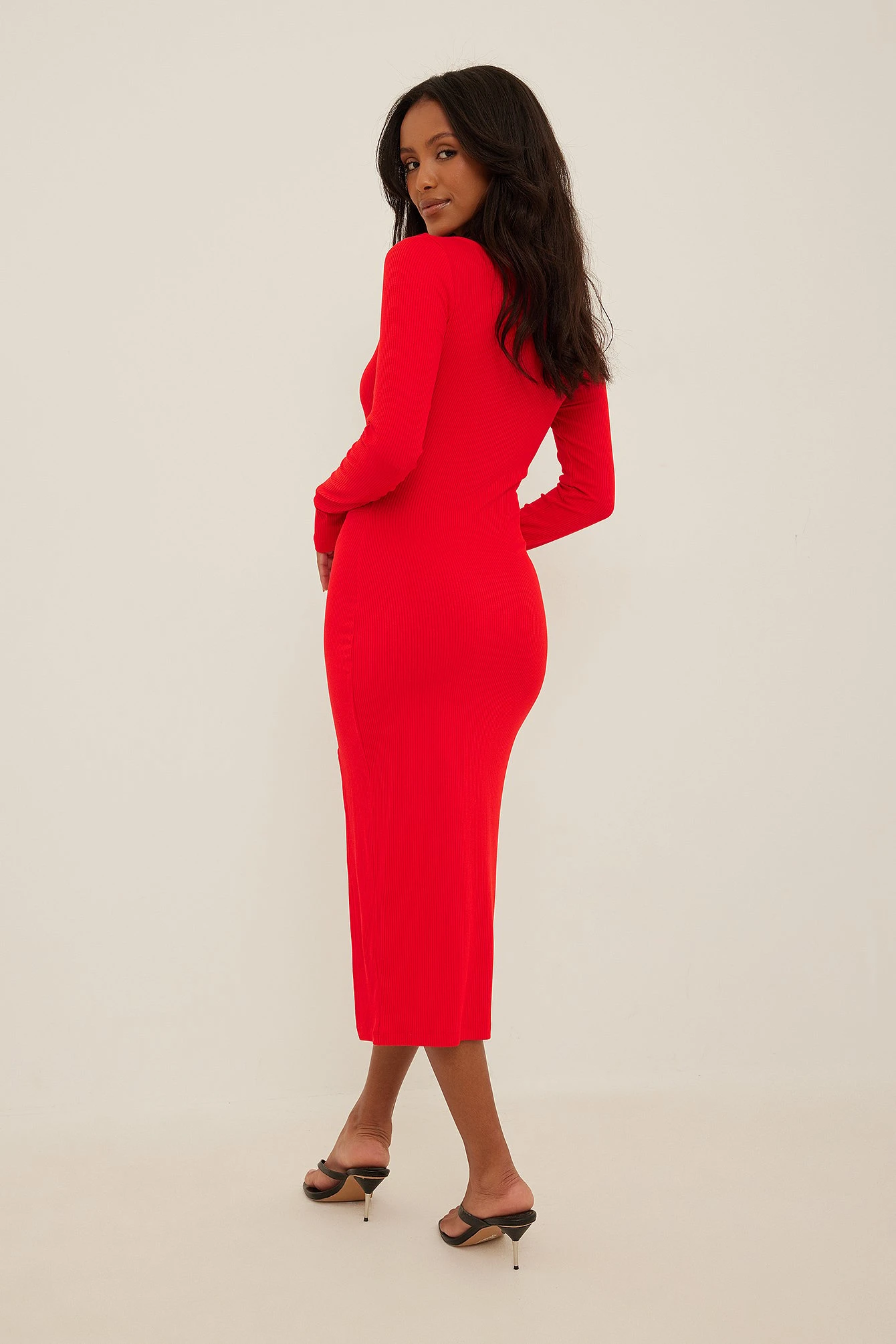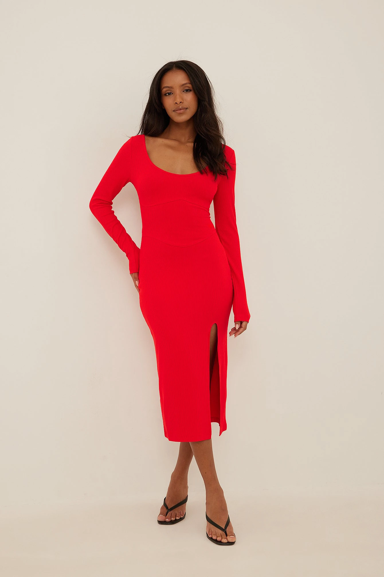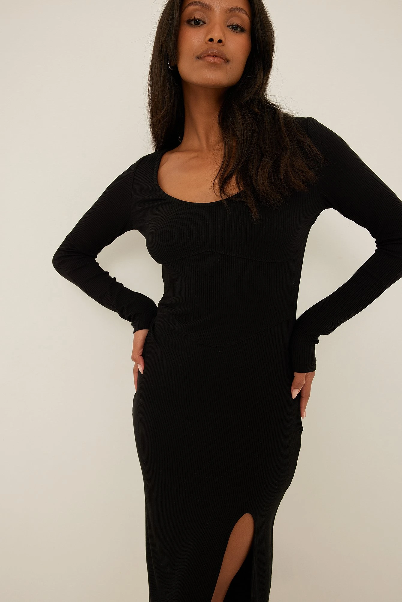 Cette robe midi a un col arrondi, des manches longues, un petit détail corset sur la poitrine et à la taille, une fente latérale, une coupe moulante et une matière élastique.