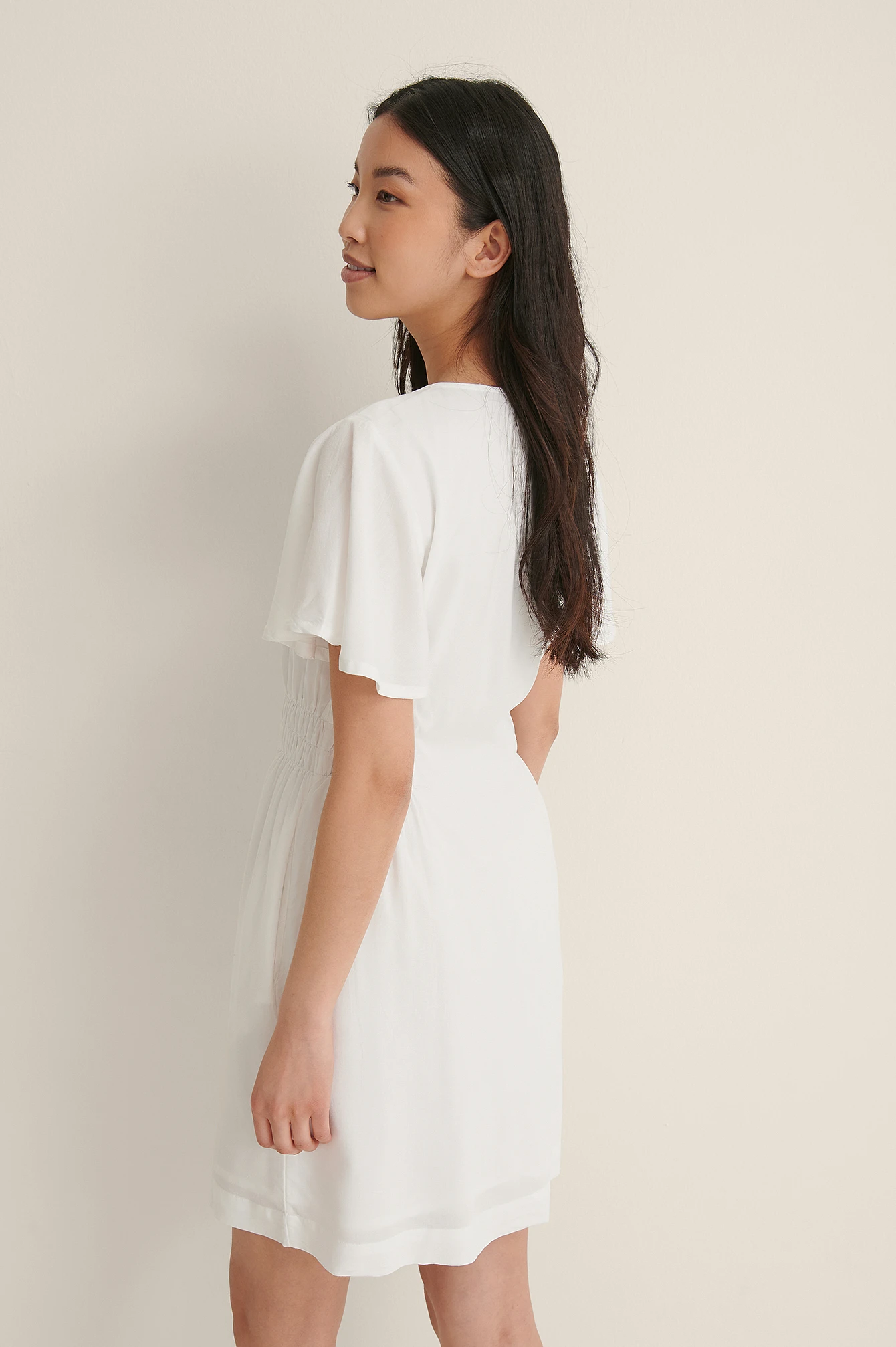 Cette robe a un col en V, des manches courtes, une doublure intĂ©rieure complète, une taille courte avec dĂ©tails boutonnĂ©s Ă l’avant et dĂ©tails froncĂ©s Ă la taille et deux poches inclinĂ©es sur le cĂ´tĂ©.
