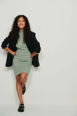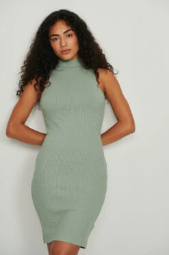 Cette robe a un col roulé, un design à côtes, de la forme serrée et une taille courte.