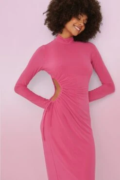 Cette robe longue a un col haut, une manche longue, un détail découpé à la taille avec cordon réglable et un toucher satin.