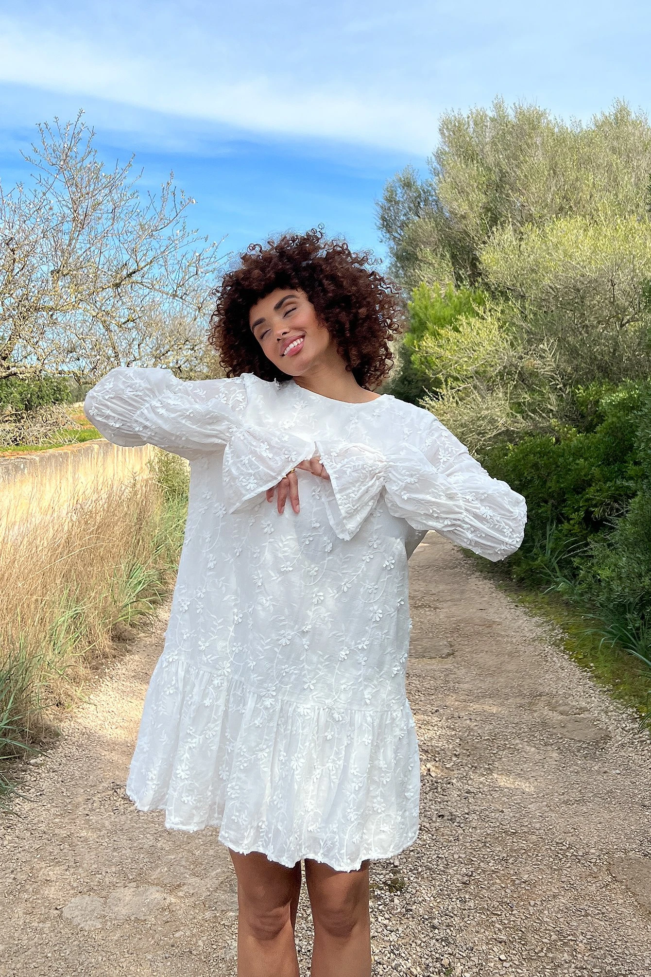 Cette robe a un col arrondi. Elle a un design à dos ouvert avec un fil fin et des manches longues avec détails élastiques. Cette robe a un design brodé et une coupe droite.