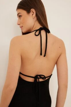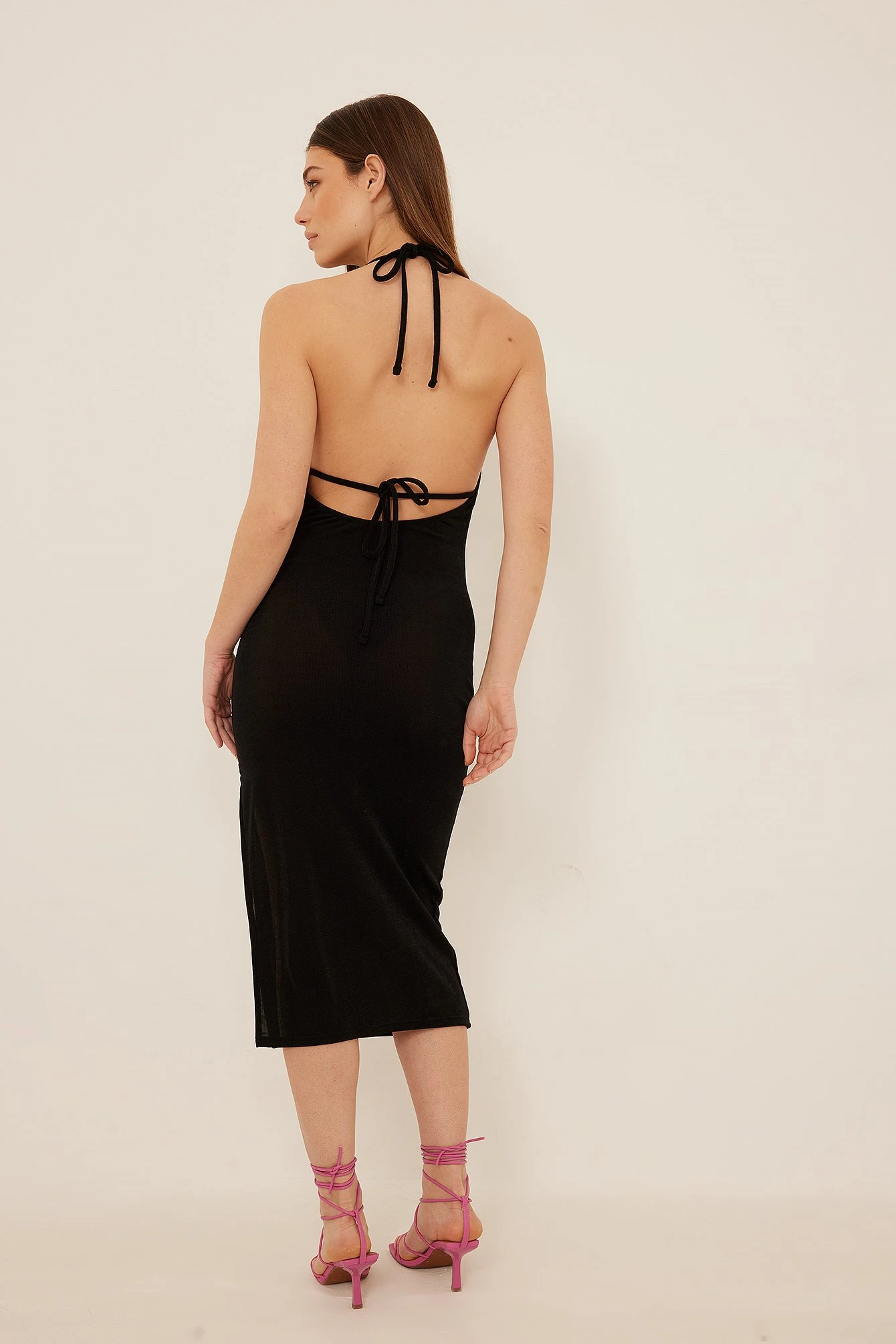 Cette robe midi a un effet cascade, des bretelles à nouer et une fente latérale.