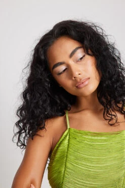 Cette robe courte a un design sans manches. Elle a des franges ruchĂ©es le long du vĂŞtement et une bretelle ajustable avec design de croix Ă l’arrière. Cette robe courte a une fermeture Ă©clair latĂ©rale.