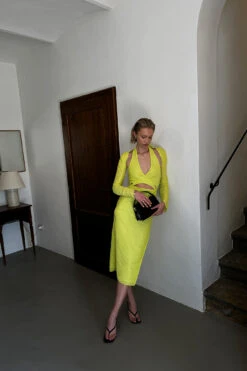 Cette robe courte a un design sans manches. Elle a des franges ruchĂ©es le long du vĂŞtement et une bretelle ajustable avec design de croix Ă l’arrière. Cette robe courte a une fermeture Ă©clair latĂ©rale.