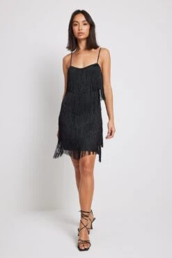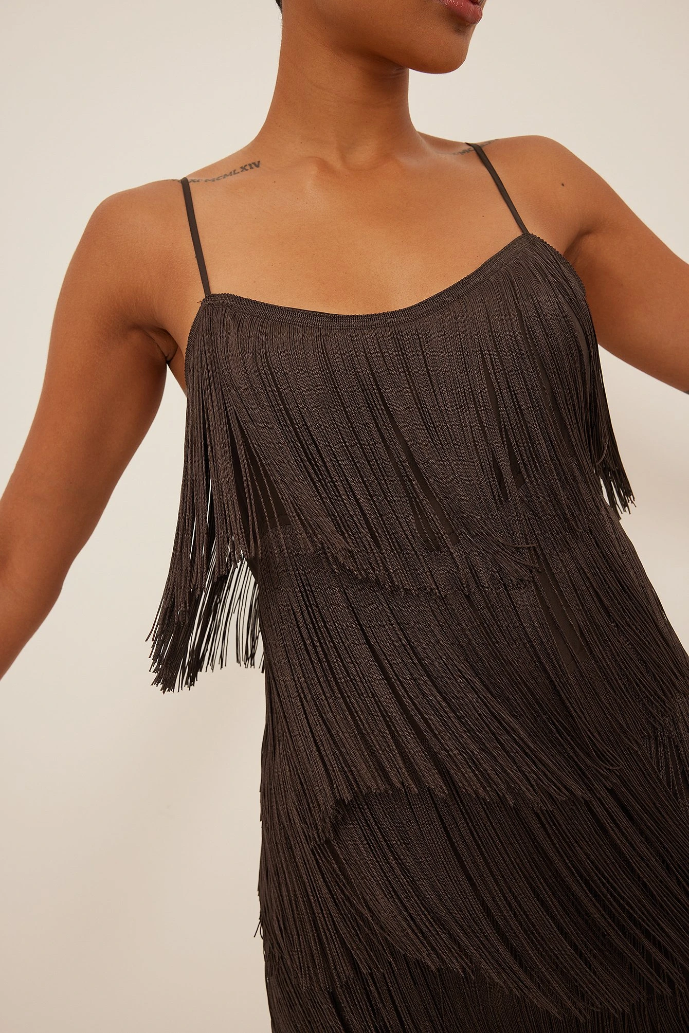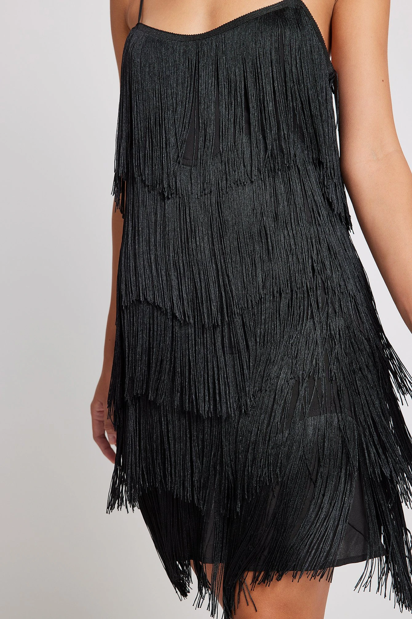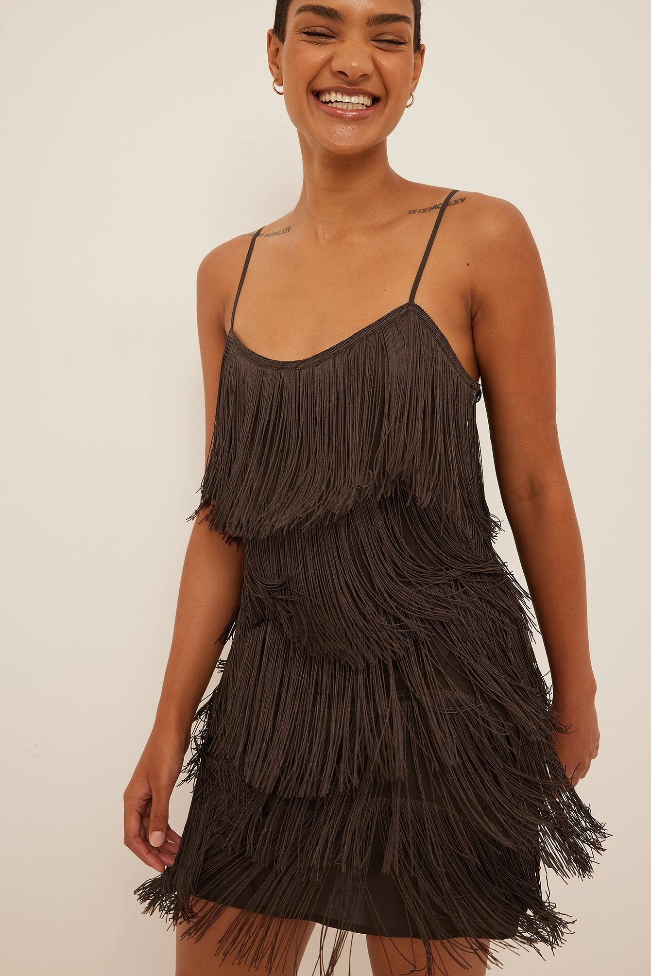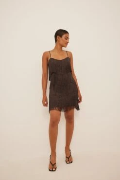 Cette robe courte est sans manches et a des franges le long du vĂŞtement et des bretelles ajustables.