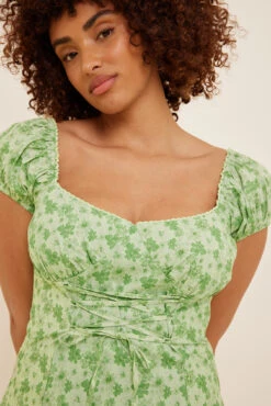 Cette robe courte a un décolleté en coeur avec petits détails en dentelle et bonnets froncés. Elle a des manches courtes bouffantes et élastiques et un laçage réglable à l’avant et à l’avant. Cette robe courte a une fermeture éclair latérale.