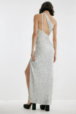 Cette robe longue a un style à une épaule, une double bretelle sur une épaule, un détail de coupe à l’avant, un découpage à l’arrière, une fente frontale haute, une fermeture éclair latérale et une matière sequin avec doublure intérieure.