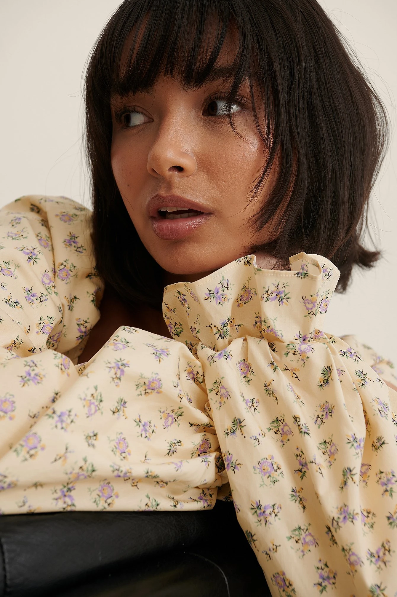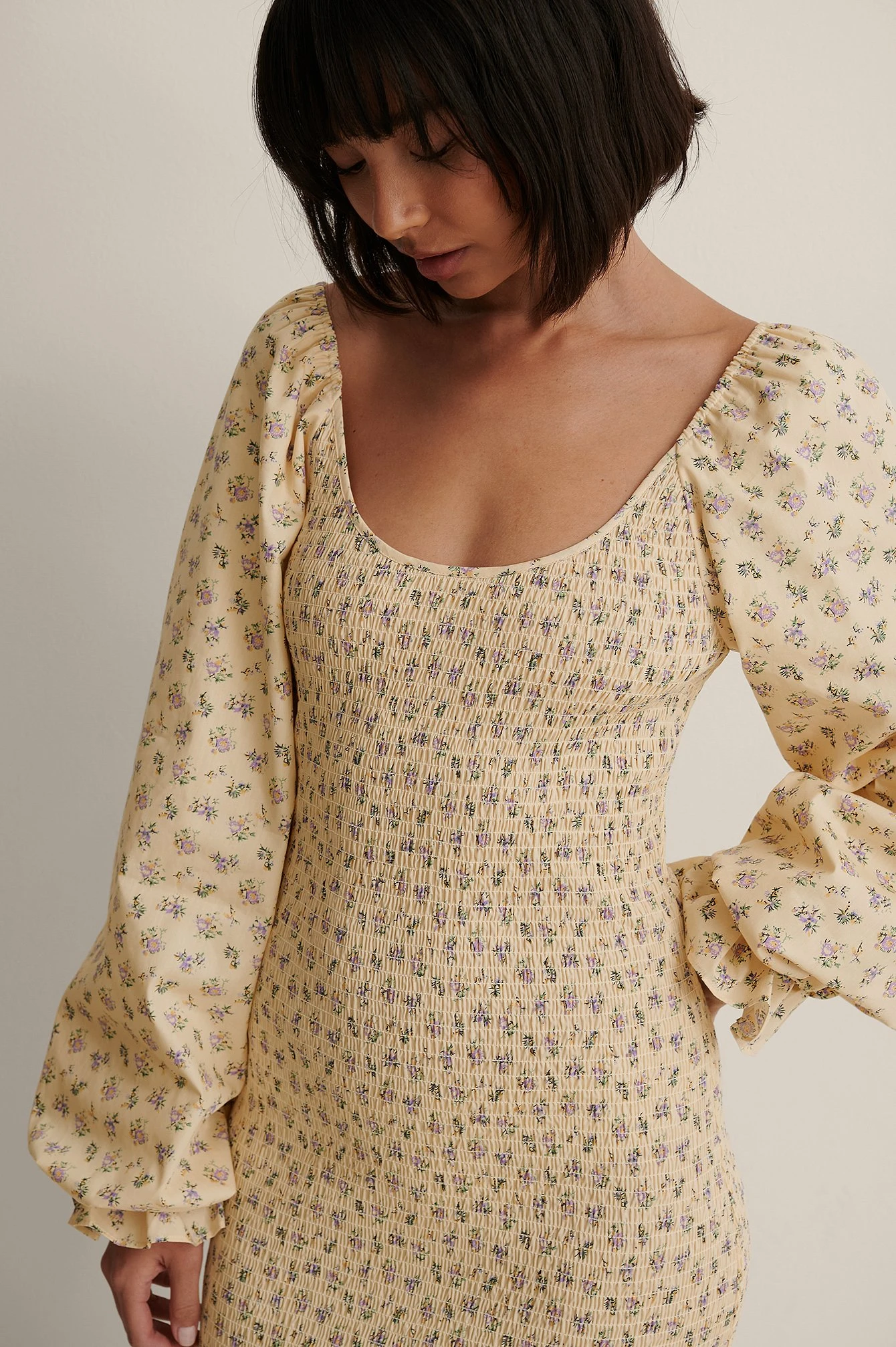Cette robe est froncée et a un col arrondi, des manches ballon, des volants sur la manche et au bas et une taille courte.