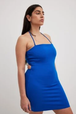 Cette robe a une taille courte. Elle a une matière élastique et un détail découpé à l’arrière. Cette robe a une bretelle tour de cou avec lacet amovible.