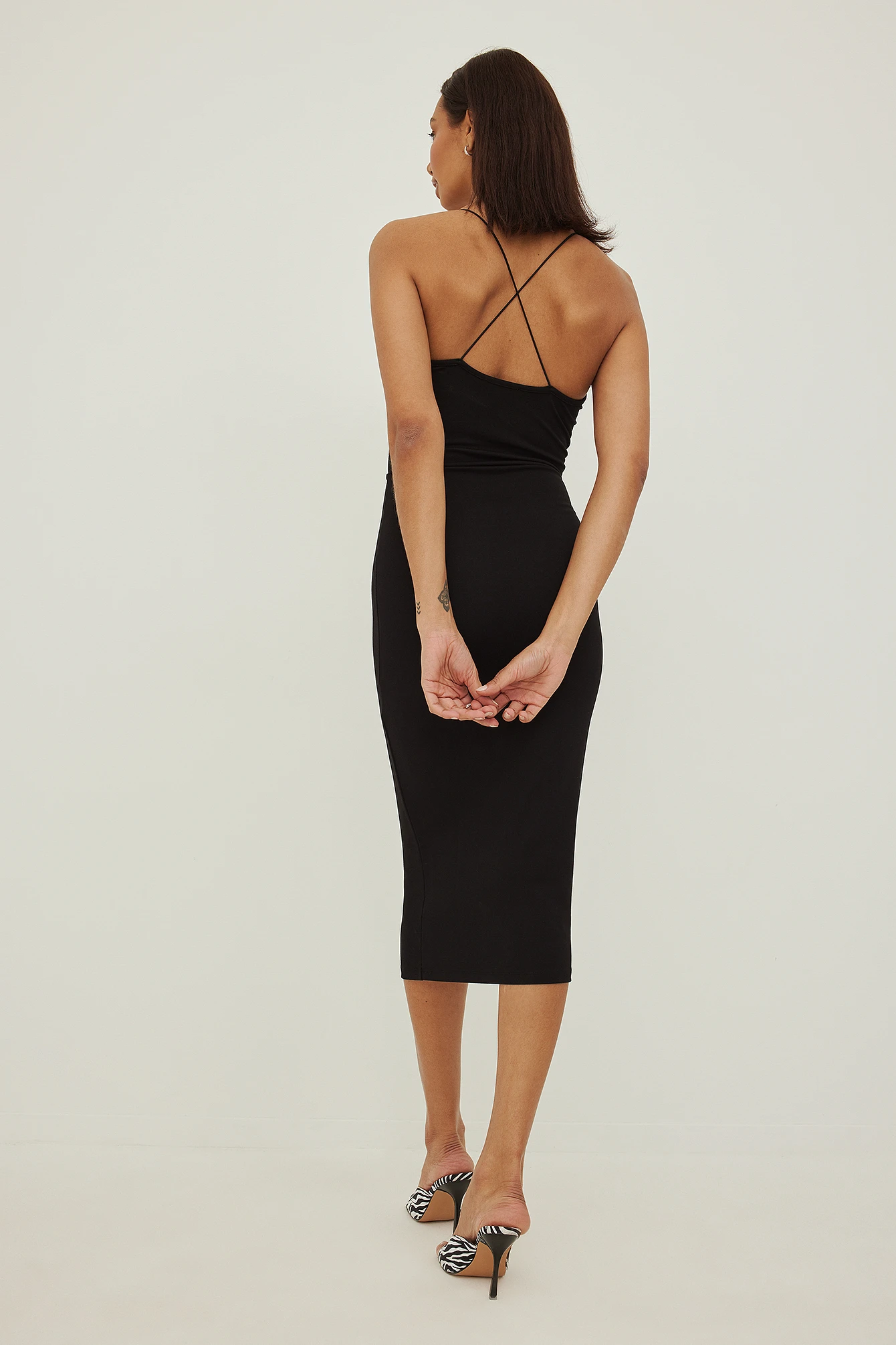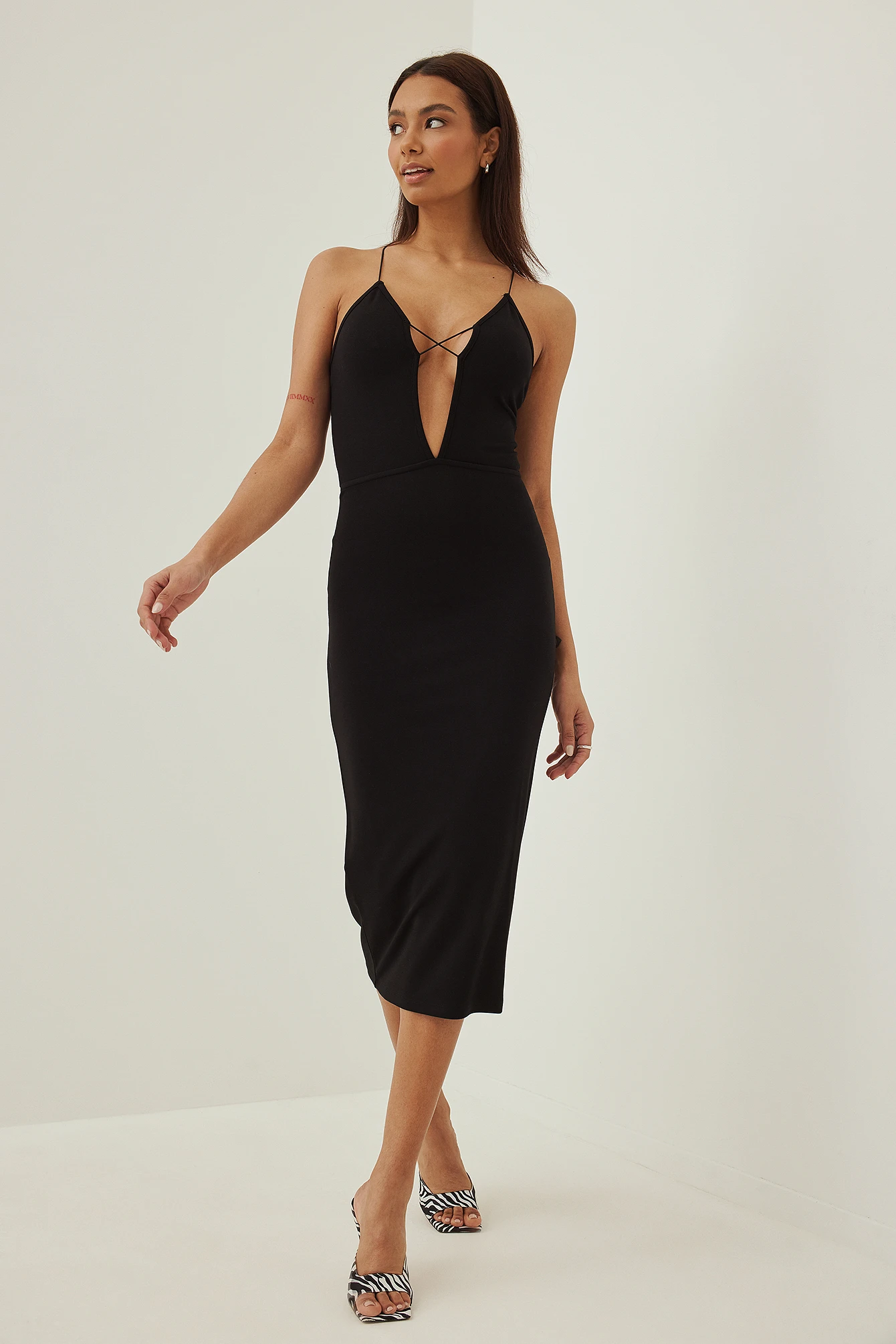 Cette robe midi a un col en V profond avec détails, des bretelles fines et une coupe moulante.
