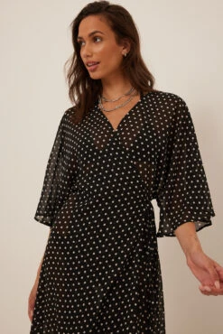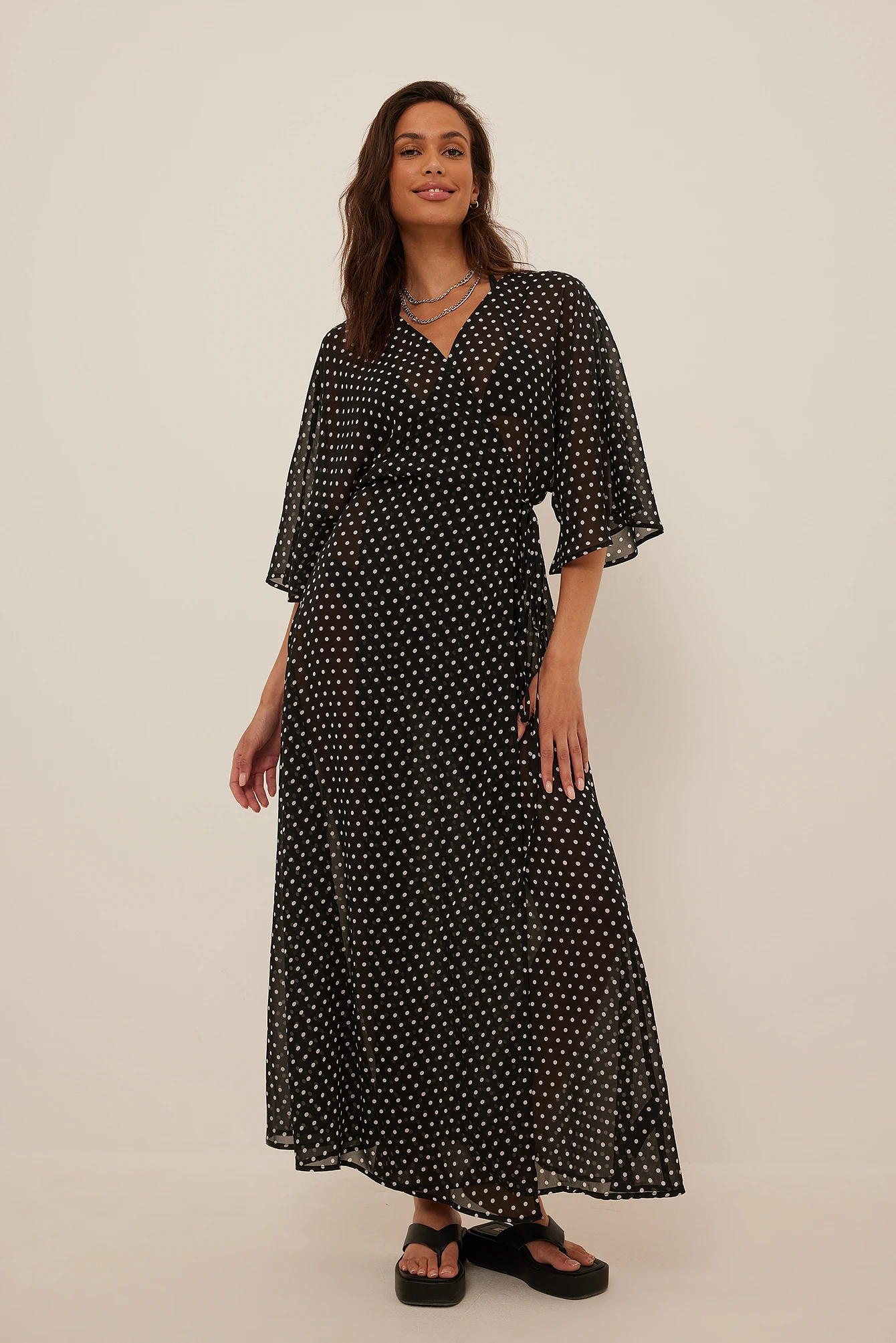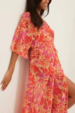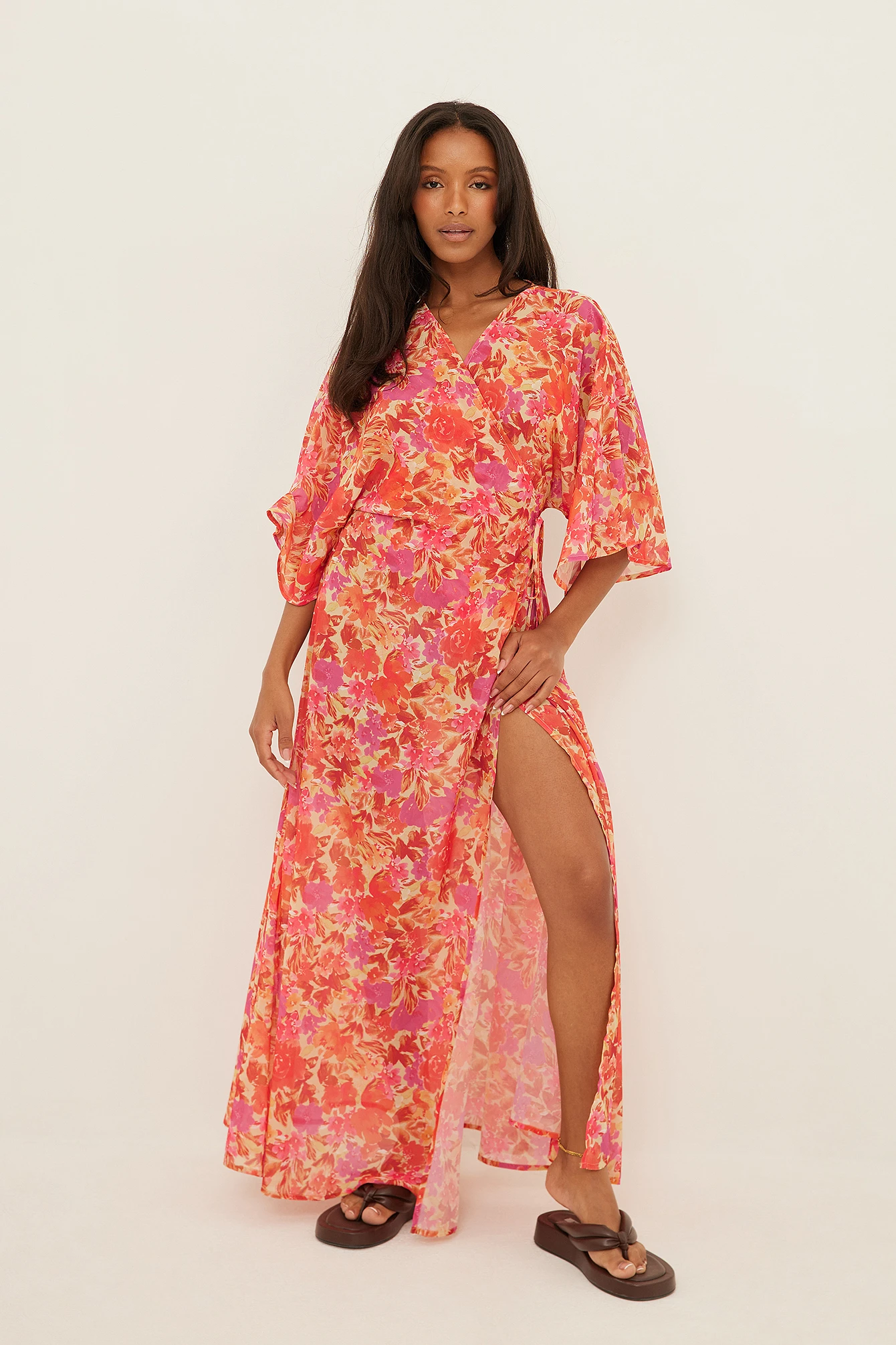 Ce caftan est fluide et idéal pour aller à la plage et a une taille longue, un design chevauchant avec noeud à nouer et des manches courtes.