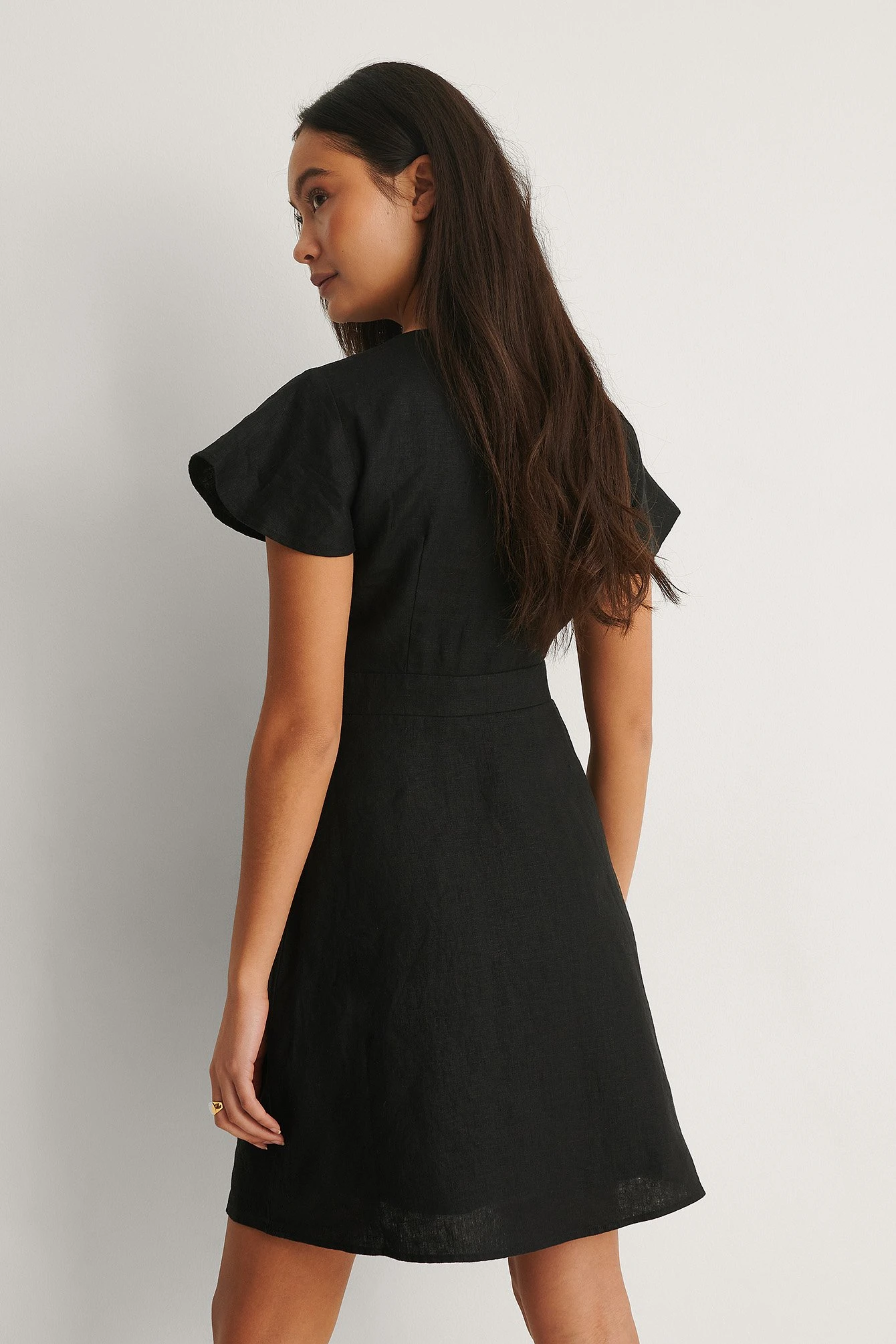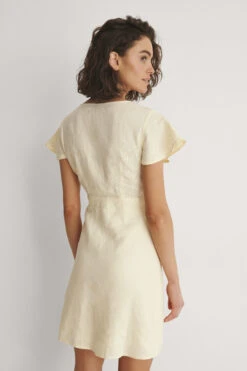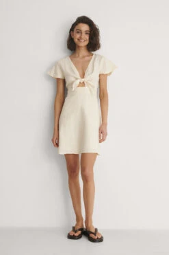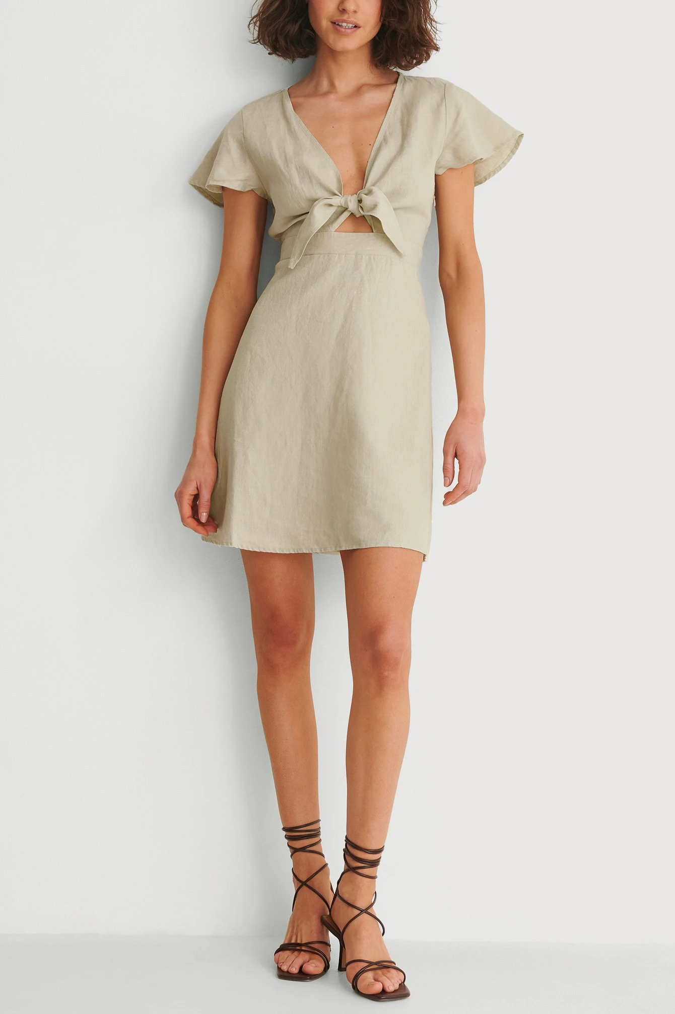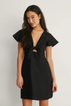 Cette robe a un col en V, une attache frontale, une double couche, des manches courtes et une taille courte.