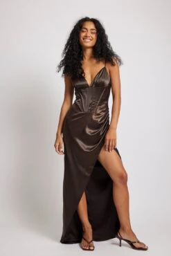 Cette robe a un col en V, des bretelles fines et réglables, un design corset sur le haut avec bonnet doux, une fermeture éclair et crochet cachée sur le côté, un froncement détaillé avec fente latérale haute et une doublure complète.