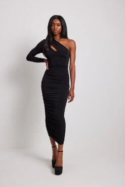 Cette robe à épaule dénudée a une manche longue, un découpage sur la poitrine, un détail de bonnet froncé et doux, un design corset, une jupe avec ruche sur les côtés et une matière élastique.