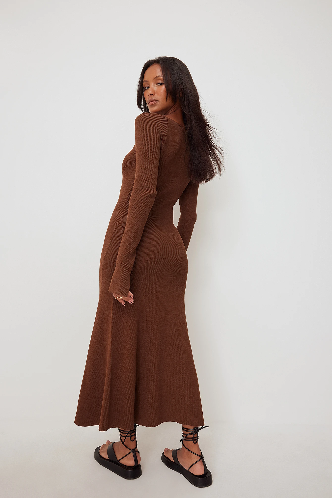 Cette robe midi a un décolleté en coeur, des bonnets détaillés, des manches longues, une coupe charmante et une matière élastique en tricot à nervures.