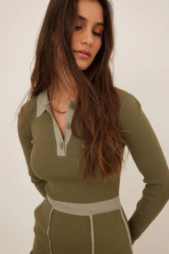 Cette robe a des manches longues, une taille courte, un col classique et une matière élastique.