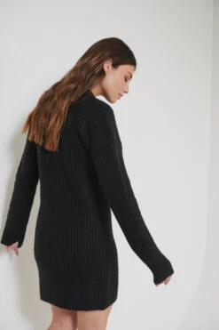 Cette robe courte est tricotée, sans manches et imprimée et a un col haut et des ourlets à nervures.
