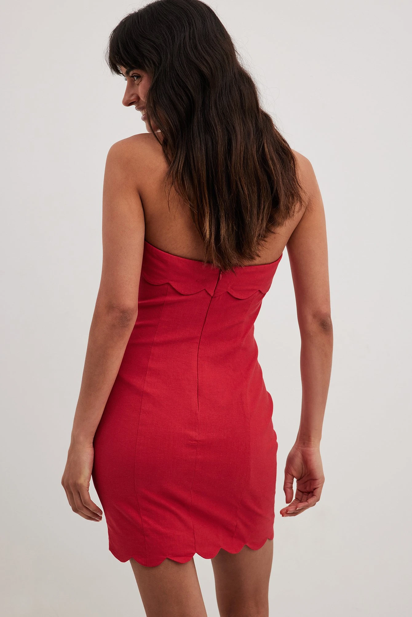 Cette robe courte a un design à bandeau. Elle a un design festonné aux ourlets et une fermeture éclair à l’arrière. Cette robe courte a une coupe moulante et une doublure.