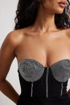 Cette robe courte a un design corset embelli avec bonnets rembourrés à armature. Elle a un dos froncé et une fermeture éclair latérale cachée. Cette robe courte a une ruche sur le côté.