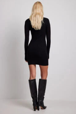 Cette robe courte est en tricot à nervures et élastique et a un col classique. Elle a des manches longues et un bouton de fermeture sur la moitié haute.