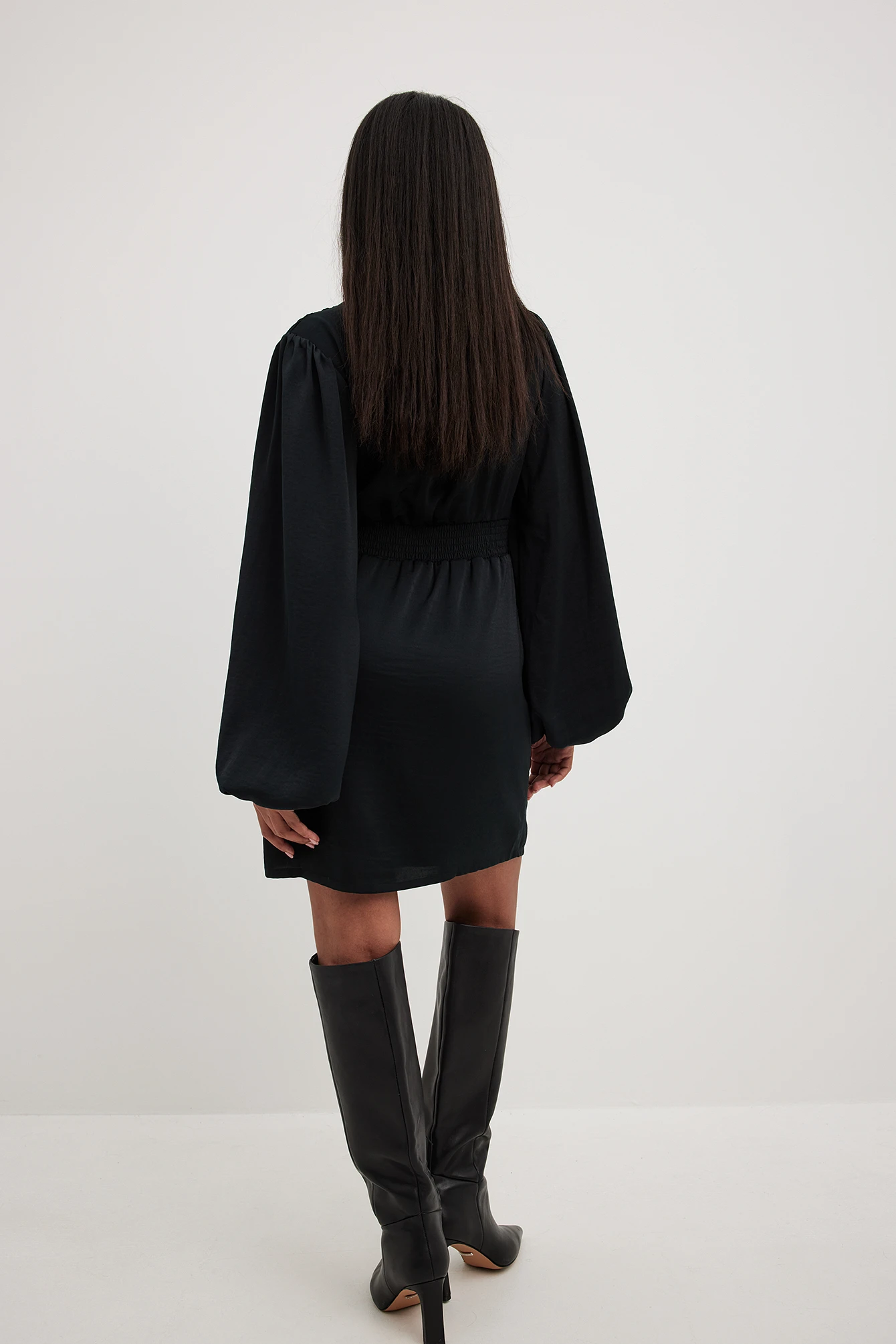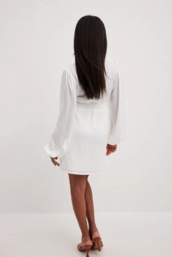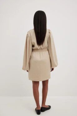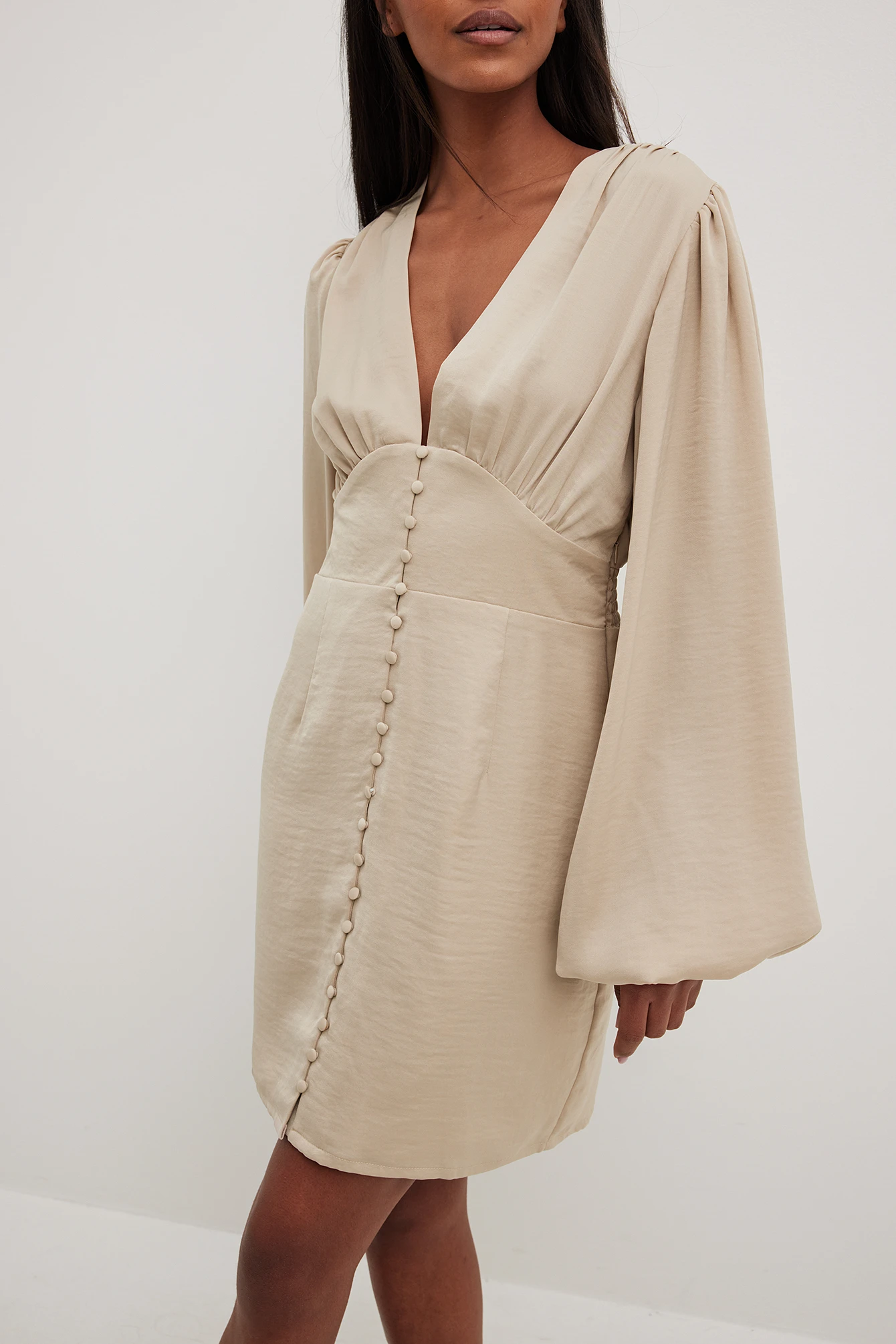 Cette robe courte a un toucher satin. Elle a un col en V et une longue manche ballon. Cette robe courte a des boutons dĂ©coratifs Ă l’avant, une taille marquĂ©e et une fermeture Ă©clair latĂ©rale.