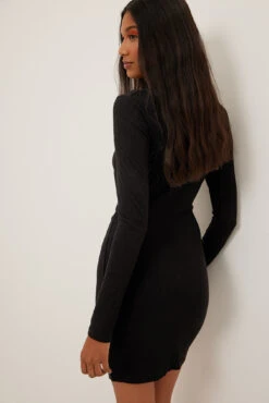 Cette robe a un col arrondi. Elle a des manches longues et un détail découpé à la taille. Cette robe a une taille courte et une matière élastique à nervures.