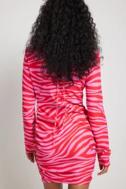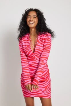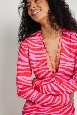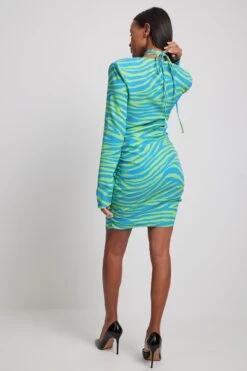 This mini dress is v-neck and features long sleeves with padded shoulders, a draped detail on the sides, a strap at the neck and a side zipper closure. This product runs small in size, we recommend you to choose 1-2 size bigger than your usual size.