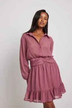 Cette robe courte est faite en dobby et a une col de chemise, un bouton sur la moitié haute, des manches longues avec boutons de manchette, une ceinture avec détail drapé et une bordure froissée au bas.