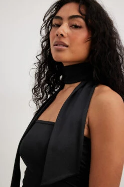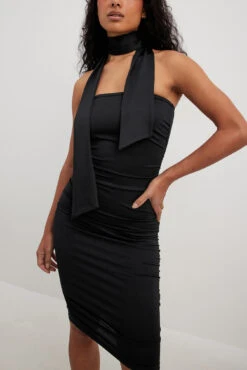 Cette robe courte a un design Ă bandeau. Elle a une dĂ©tail d’Ă©charpe sĂ©parĂ©e et une garniture intĂ©rieure en silicone. Cette robe courte a des dĂ©tails froncĂ©s sur les cĂ´tĂ©s et une matière Ă©lastique.