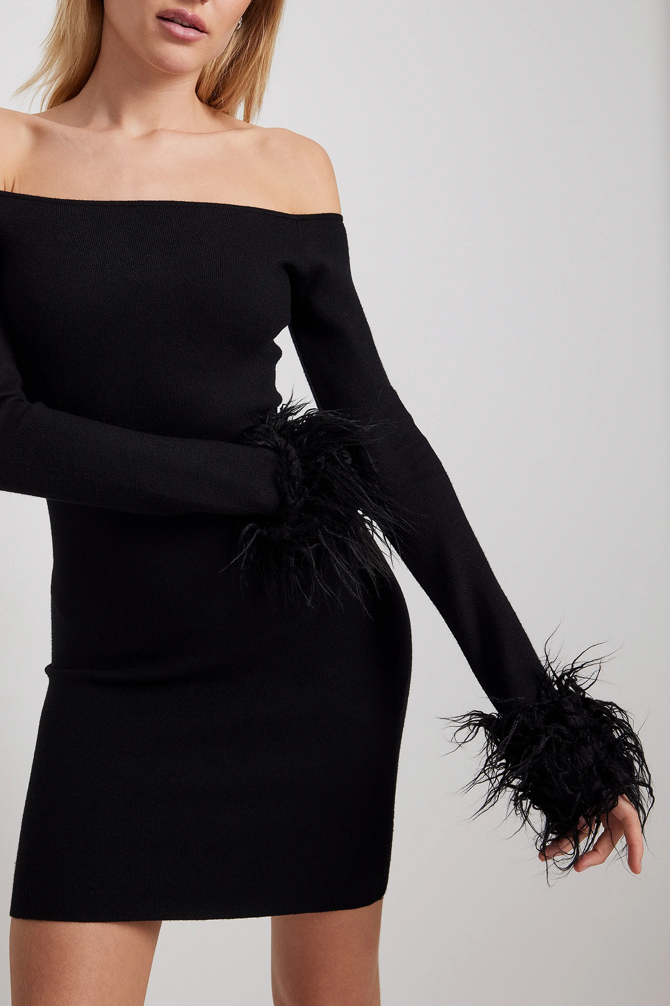 Cette robe courte est tricotée et a une coupe moulante, un col carré et des manches longues avec fausse fourrure attachée et détachable sur les manchettes.