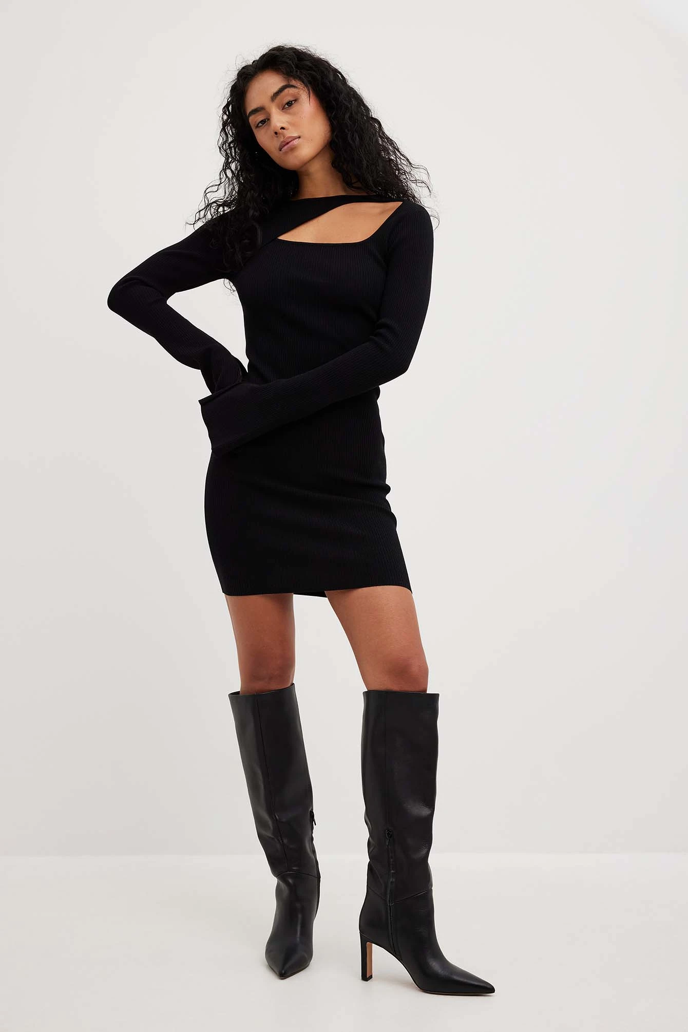 Cette robe courte est en tricot fin et a une coupe moulante et un détail découpé sur la poitrine. Elle a des manches longues avec détail fendu.
