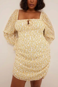 Cette robe a un col carré avec noeud de bretelles réglable, des froncements détaillés sur la poitrine, des cordons réglables sur les côtés, une manchette élastique, des manches longues transparentes et bouffantes et une taille courte avec doublure intérieure complète.