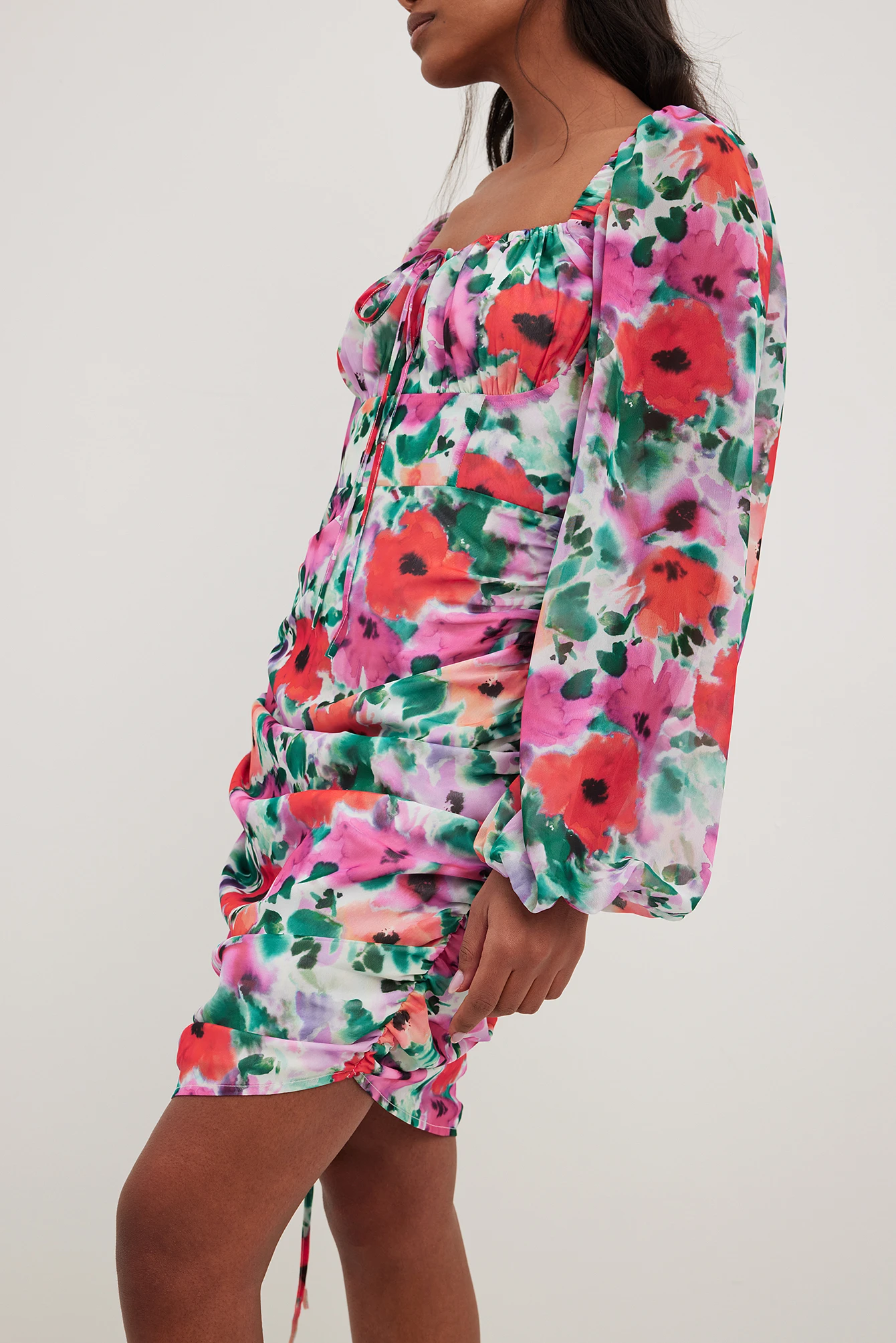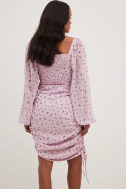 Cette robe est à doublure et courte et a une matière avec de la en mousseline de soie. Elle a un col carré avec détail à cordon coulissant et un cordon réglable sur un côté. Cette robe a des manches ballon transparentes avec lanière élastique aux épaules et sur la manche, des smocks et une fermeture éclair latérale.