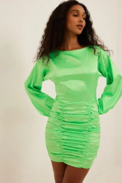 Cette robe courte a de la forme serrée froncée sur la partie basse, une coupe ample légèrement sur le haut, des manches longues larges avec manchettes élastiques et froncées et une fermeture éclair cachée sur le côté.