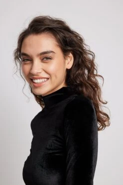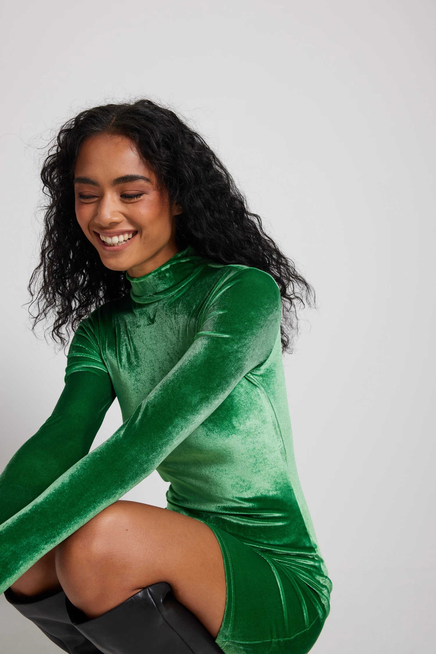 Cette robe courte est Ă©lastique et faite en velours et a un col haut, des manches longues et un bouton de fermeture Ă l’arrière de la nuque.