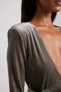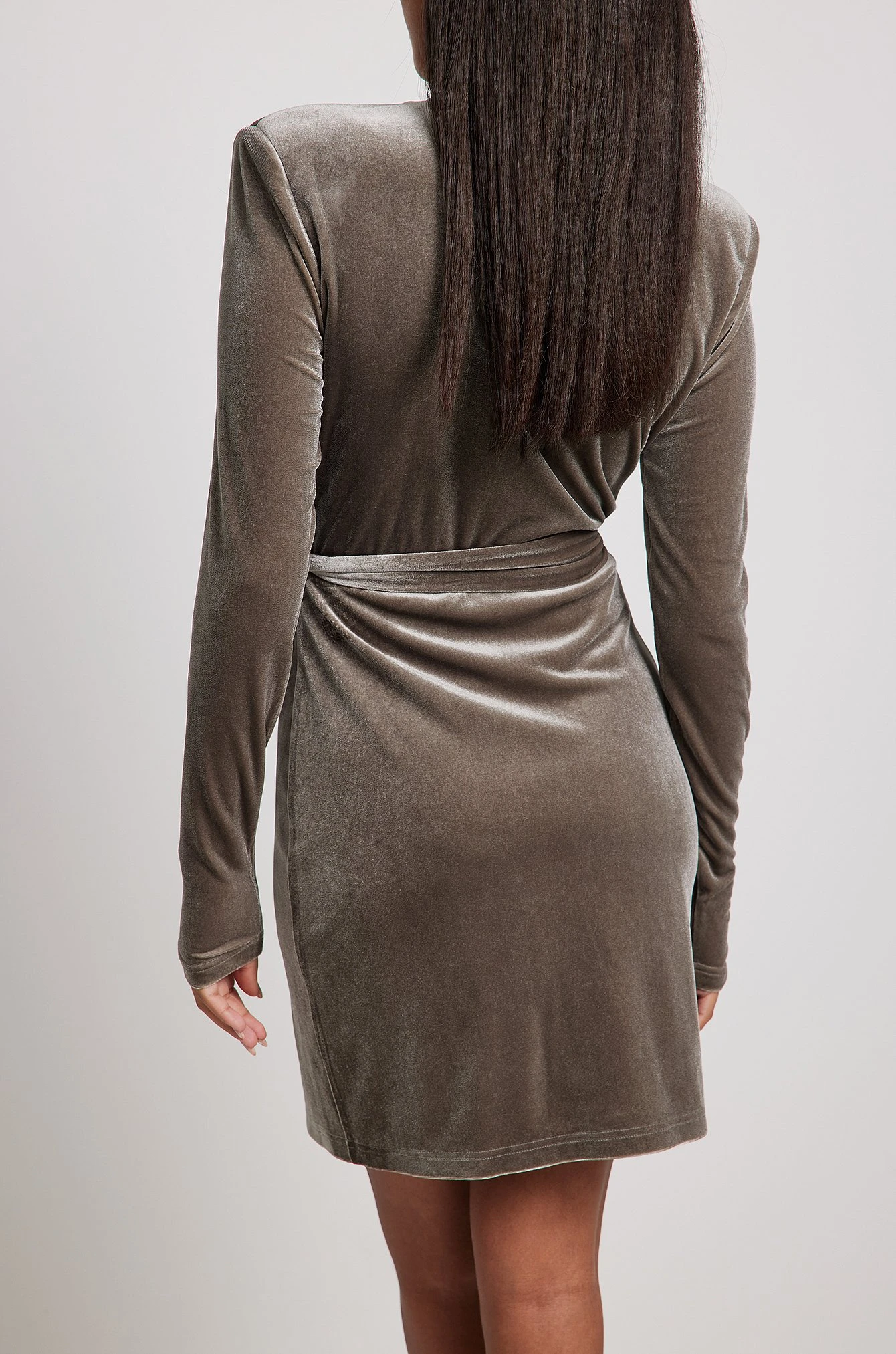 Cette robe courte est faite en velours et a des manches longues. Elle a un col en V profond avec design enveloppant avec détail ceinturé.