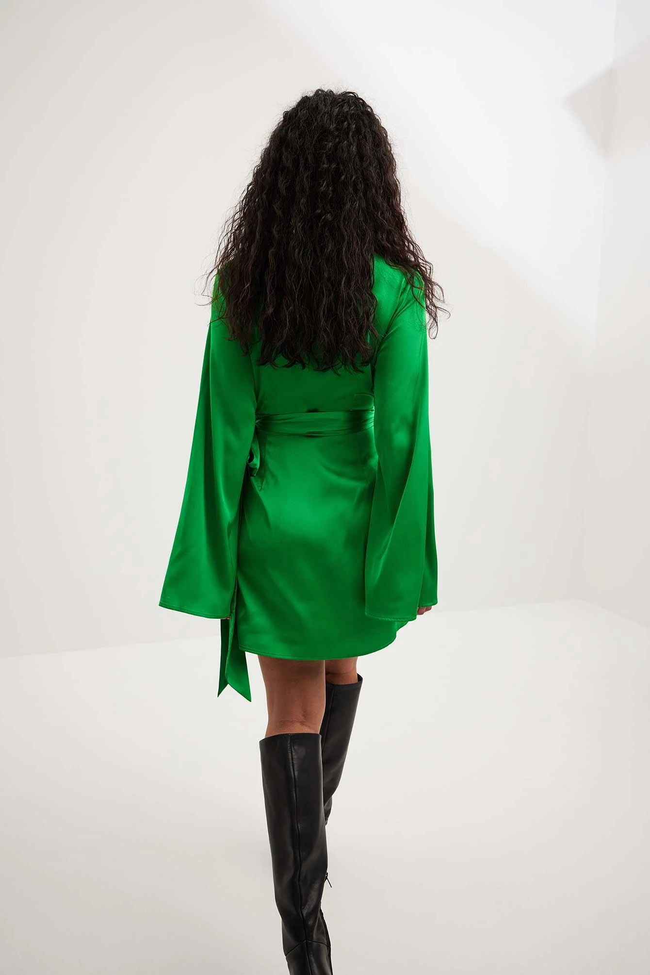 Cette robe courte a une coupe fluide. Elle a un design enveloppant avec noeud à nouer et un col en V. Cette robe courte a des manches longues.