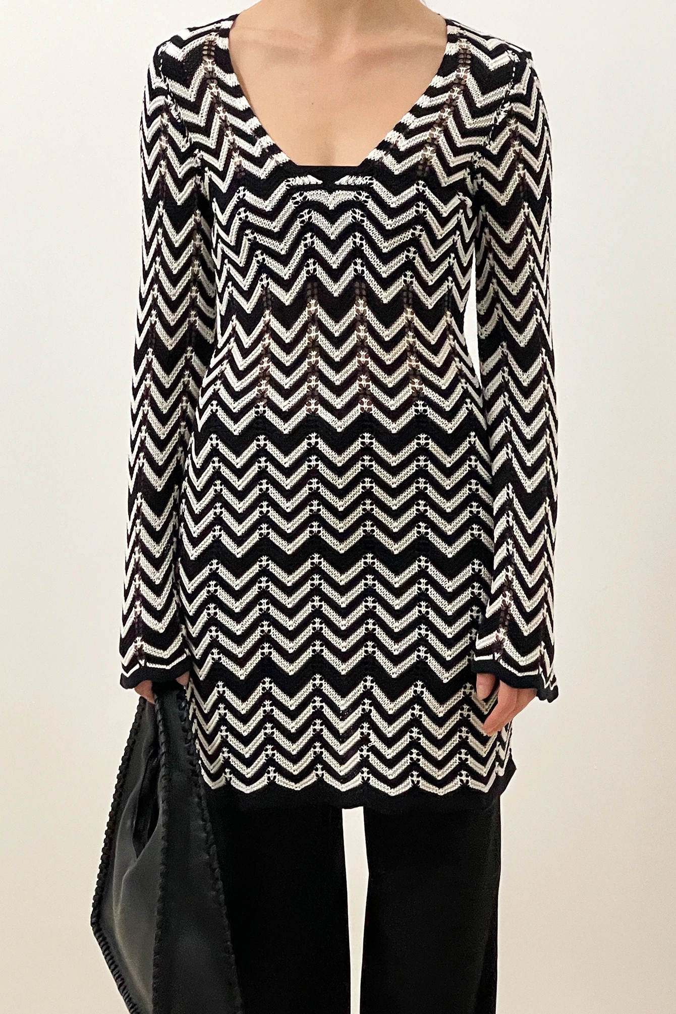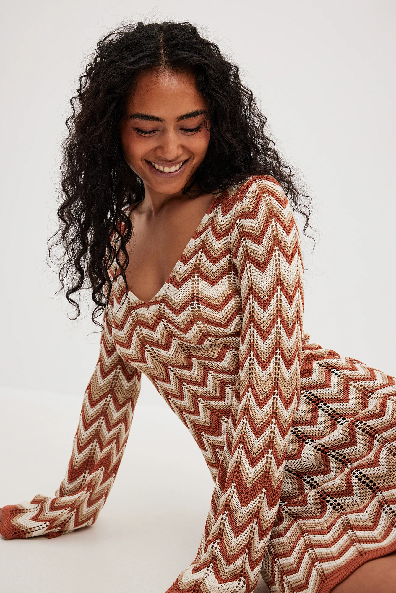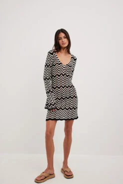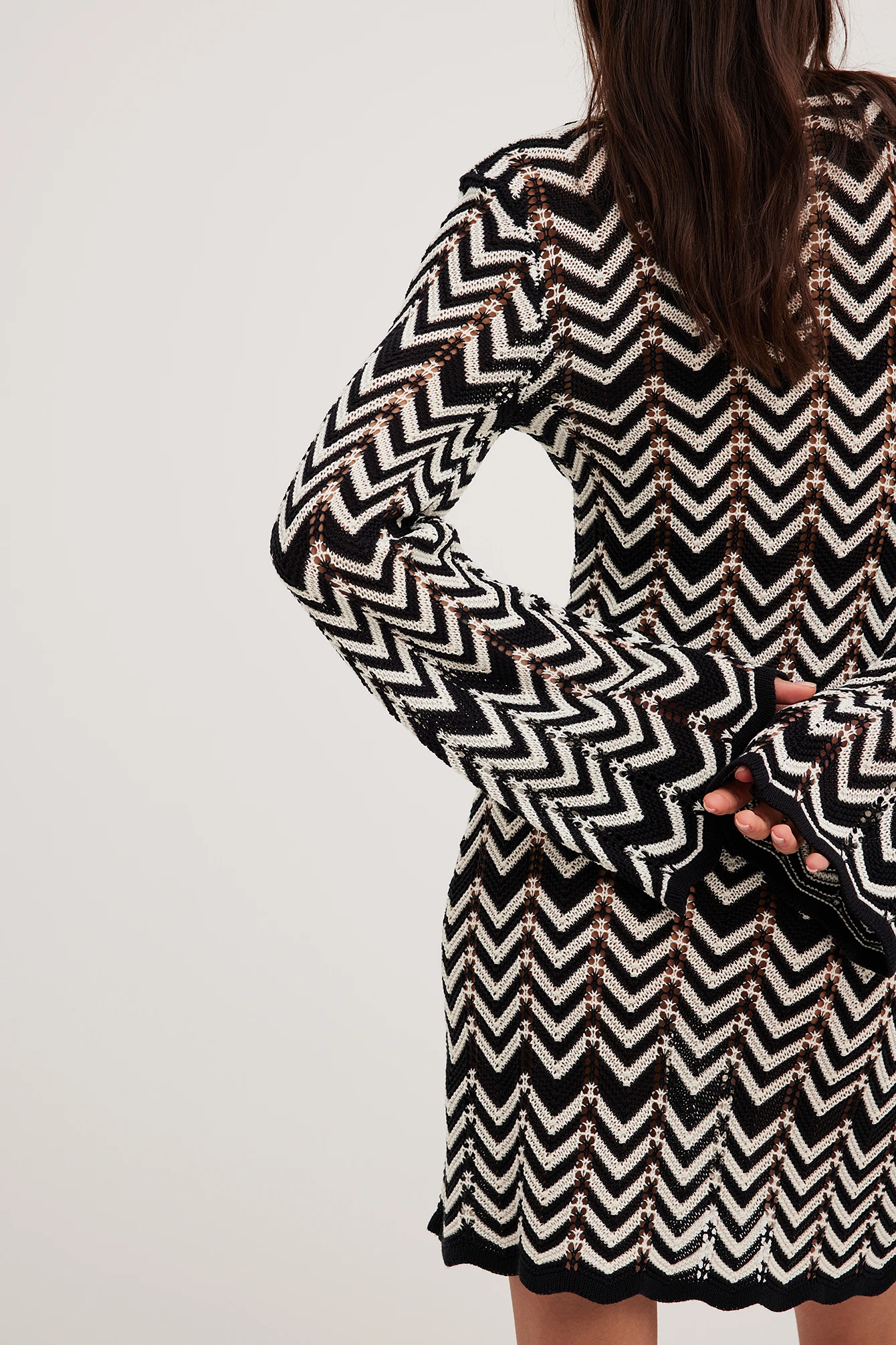Cette robe courte est à hauteur de genou et a un tissu tricoté élastique et une coupe fluide. Elle a un col en V et des manches longues trompette. Notre robe courte a des détails ondulés sur les manchettes et aux ourlets.