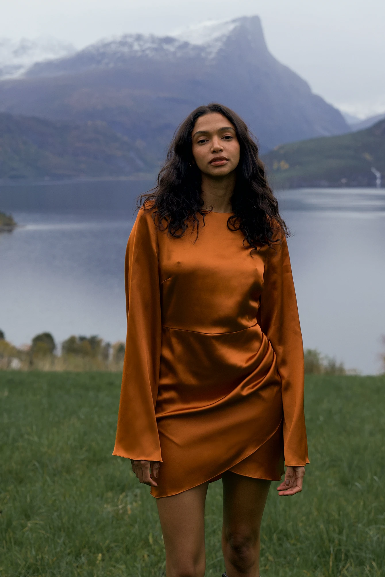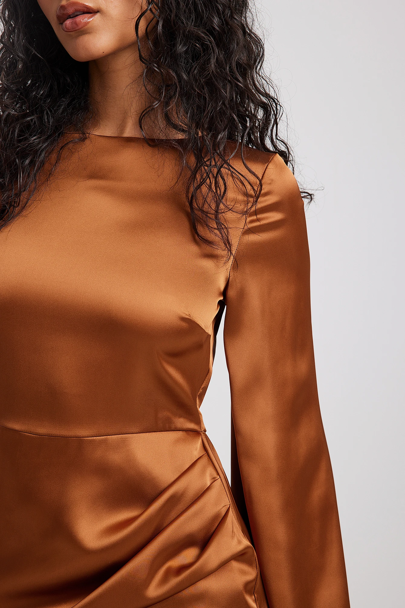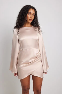 Cette robe courte est faite en satin et a une encolure bateau avec bouton de fermeture à l’arrière, des manches longues avec une coupe évasée, un détail drapé sur un côté et une jupe avec détail enveloppé.